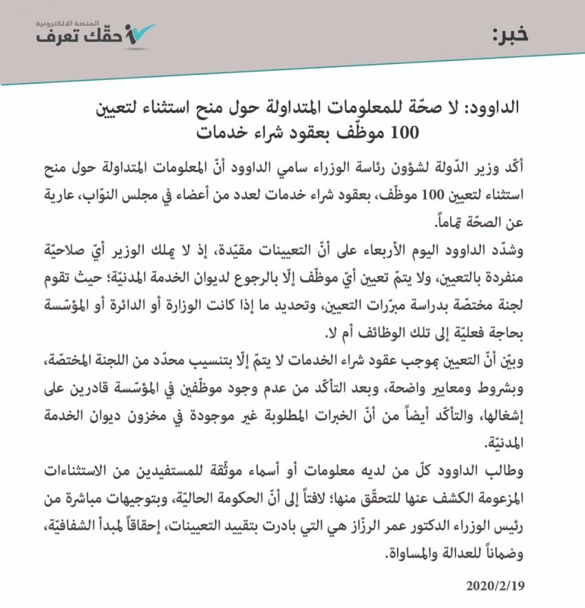 وطالب الداوود كلّ من لديه معلومات أو أسماء موثّقة للمستفيدين من الاستثناءات المزعومة الكشف عنها للتحقّق منها؛ لافتاً إلى أنّ الحكومة الحاليّة، وبتوجيهات مباشرة من رئيس الوزراء الدكتور عمر الرزّاز هي التي بادرت بتقييد التعيينات، إحقاقاً لمبدأ الشفافيّة، وضماناً للعدالة والمساواة.