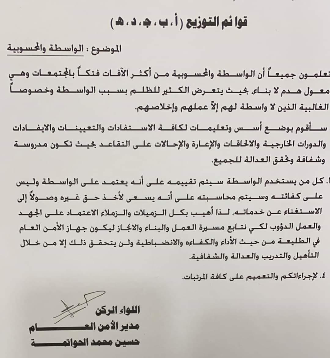 أحداث اليوم - عمم مدير الأمن العام اللواء حسين الحواتمة على جميع مرتبات الأمن العام كتاباً لمحاربة الواسطة والمحسوبية.