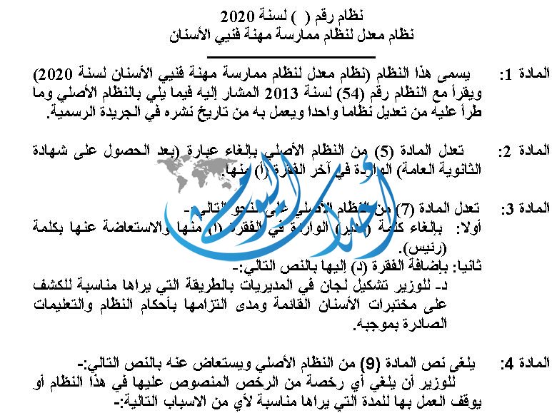 المادة 1: يسمى هذا النظام (نظام معدل لنظام ممارسة مهنة فنيي الأسنان لسنة 2020) ويقرأ مع النظام رقم (54) لسنة 2013 المشار إليه فيما يلي بالنظام الأصلي وما طرأ عليه من تعديل نظاما واحدا ويعمل به من تاريخ نشره في الجريدة الرسمية.