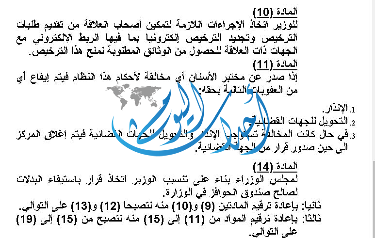 د- للوزير تشكيل لجان في المديريات بالطريقة التي يراها مناسبة للكشف على مختبرات الأسنان القائمة ومدى التزامها بأحكام النظام والتعليمات الصادرة بموجبه.