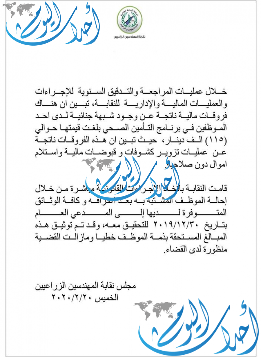 أحداث اليوم - ياسر شطناوي - قررت نقابة المهندسين الزراعيين تحويل أحد الموظفين لديها إلى الإدعاء العام بعد أكتشاف شبهات جنائية مالية بقيمة 115 الف دينار.