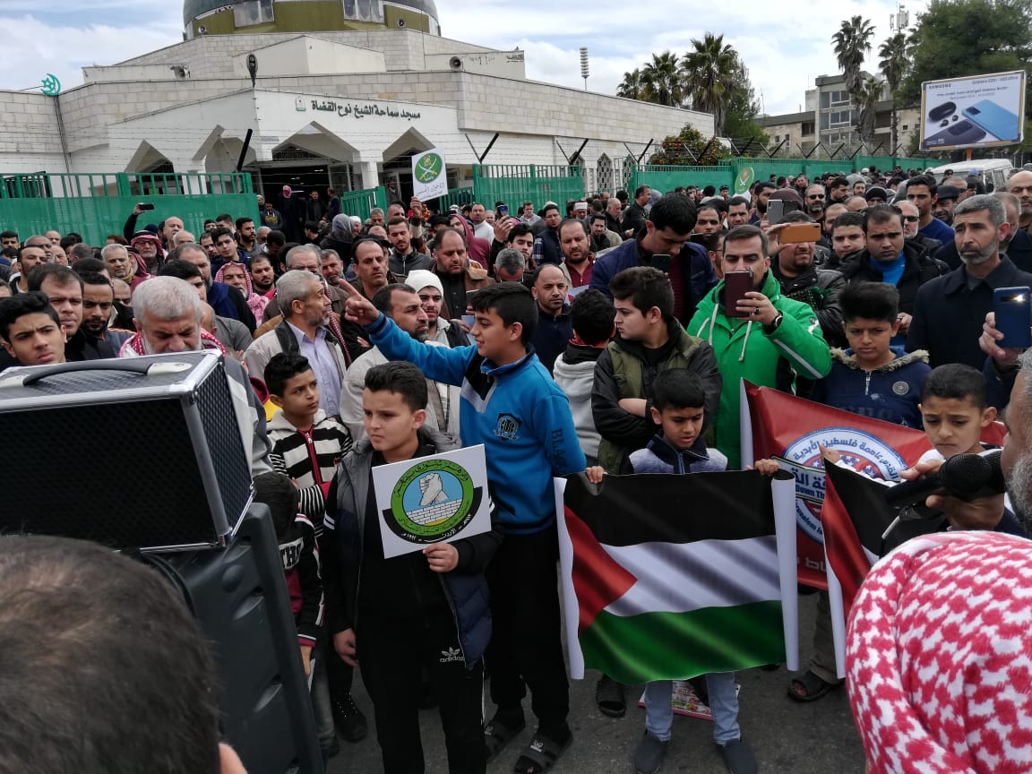 وصدحت حناجر المشاركين بهتافات نددت بصفقة القرن، والتأكيد على أن القدس كاملة عربية وعاصمتها القدس الشريف.