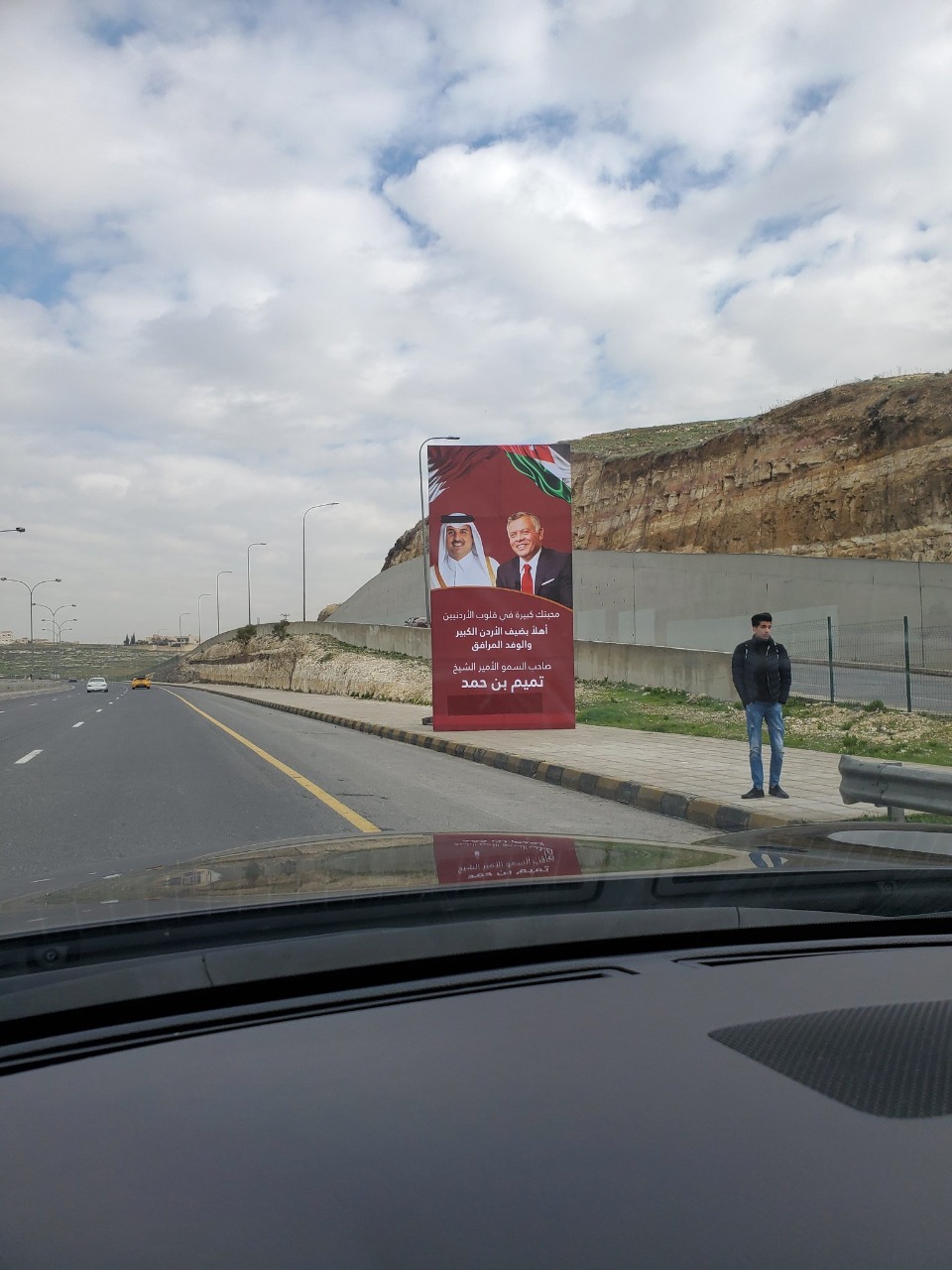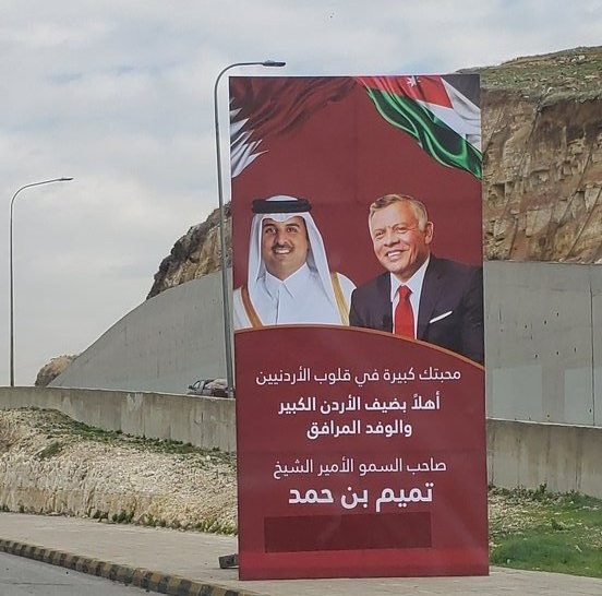 وكُتب على اليافطات عبارات ترحيبية بالأمير تميم والوفد المرافق له في بلده الثاني الأردن.