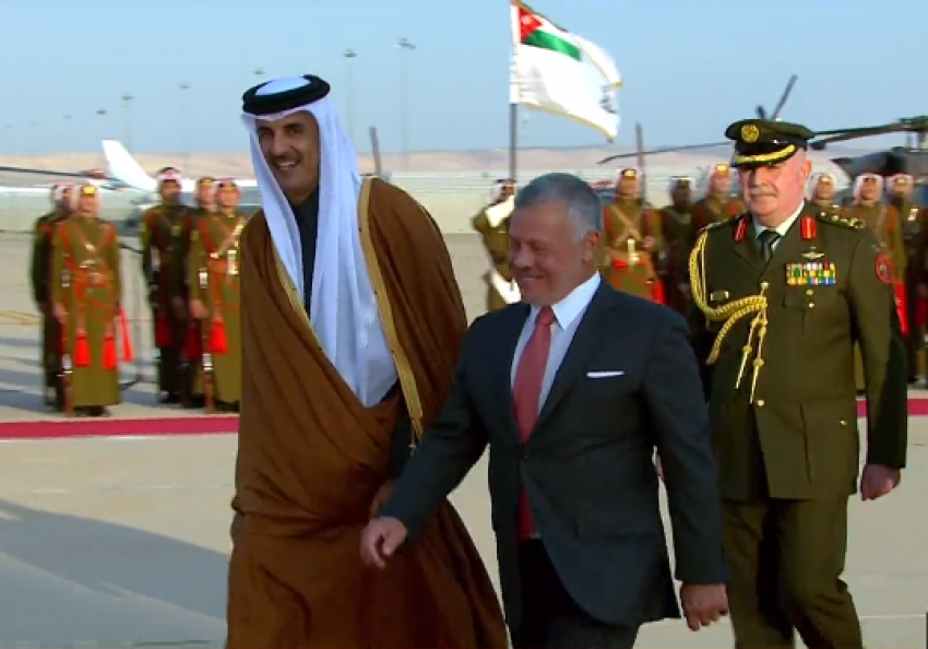 وجرت لضيف الأردن الكبير لدى وصوله مطار الملكة علياء الدولي، مراسم استقبال رسمية، حيث أطلقت المدفعية إحدى وعشرين طلقة تحيّة للضيف، فيما عزفت الموسيقى السلامين الوطني القطري والملكي الأردني.