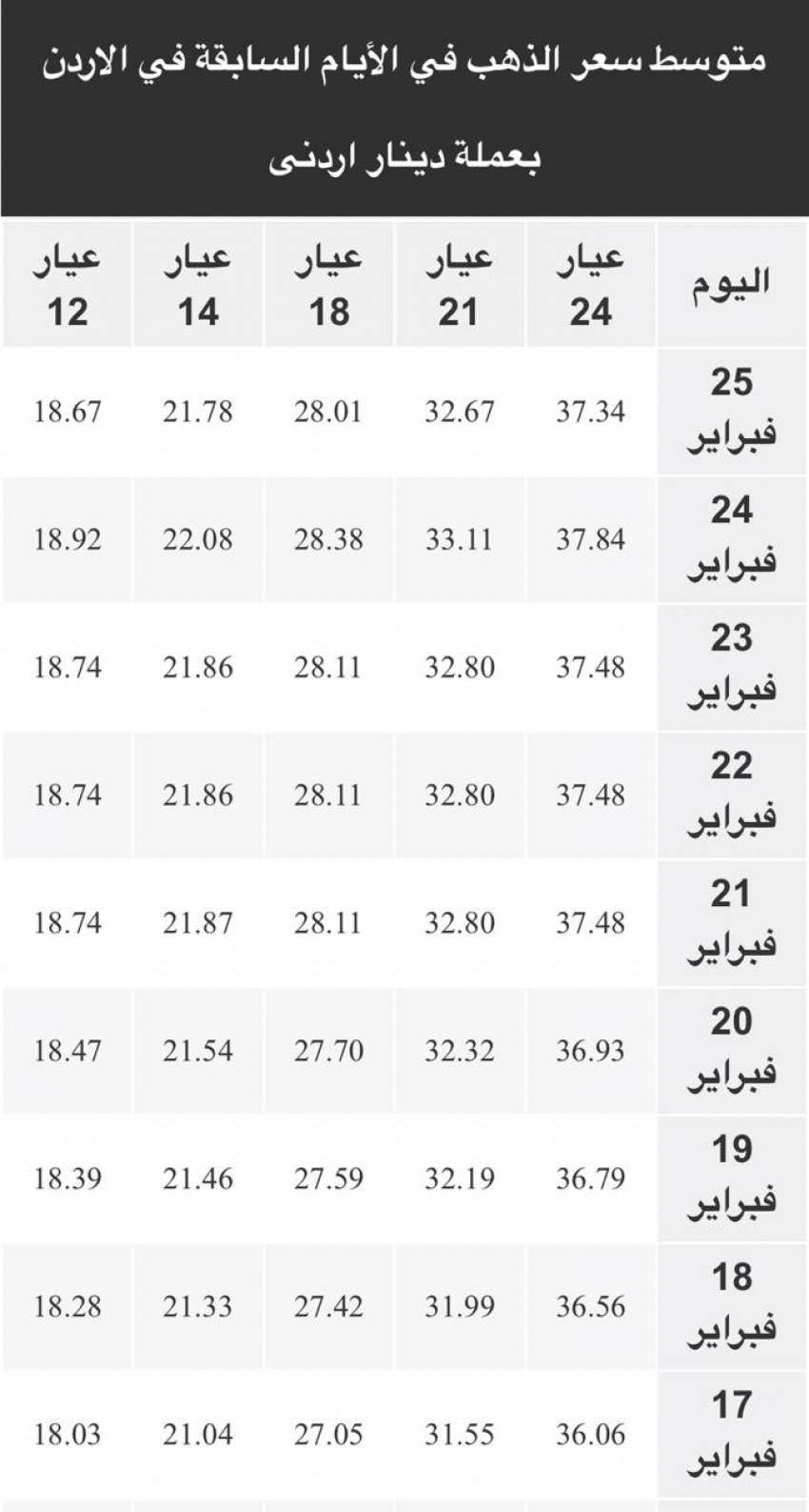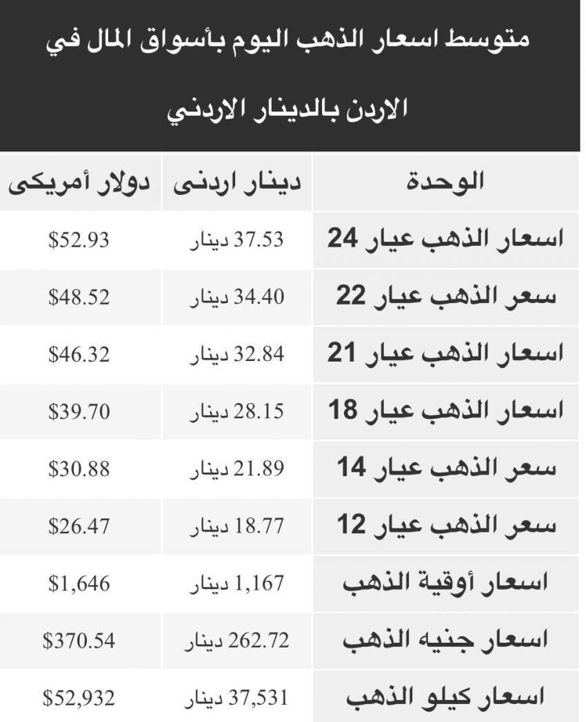 أحداث اليوم - بلغ سعر بيع الغرام من الذهب الاربعاء من عياري 24 و18 لغايات الشراء من محلات الصاغة 37.53 دينار و 28.15 ينار على التوالي.