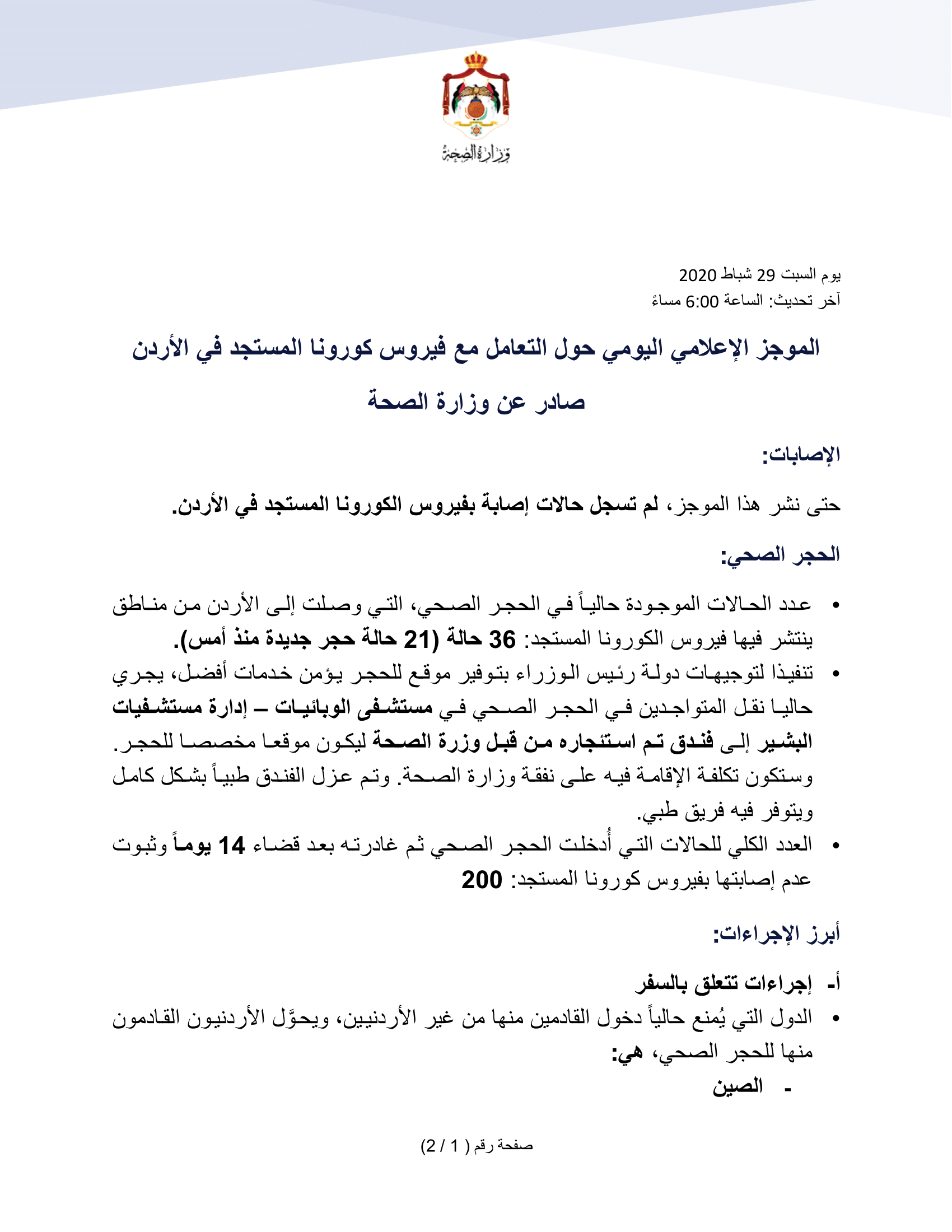 قالت وزارة الصحة إنه حتى مساء اليوم السبت لم يسجل أي اصابة بفيروس كورونا في الأردن.