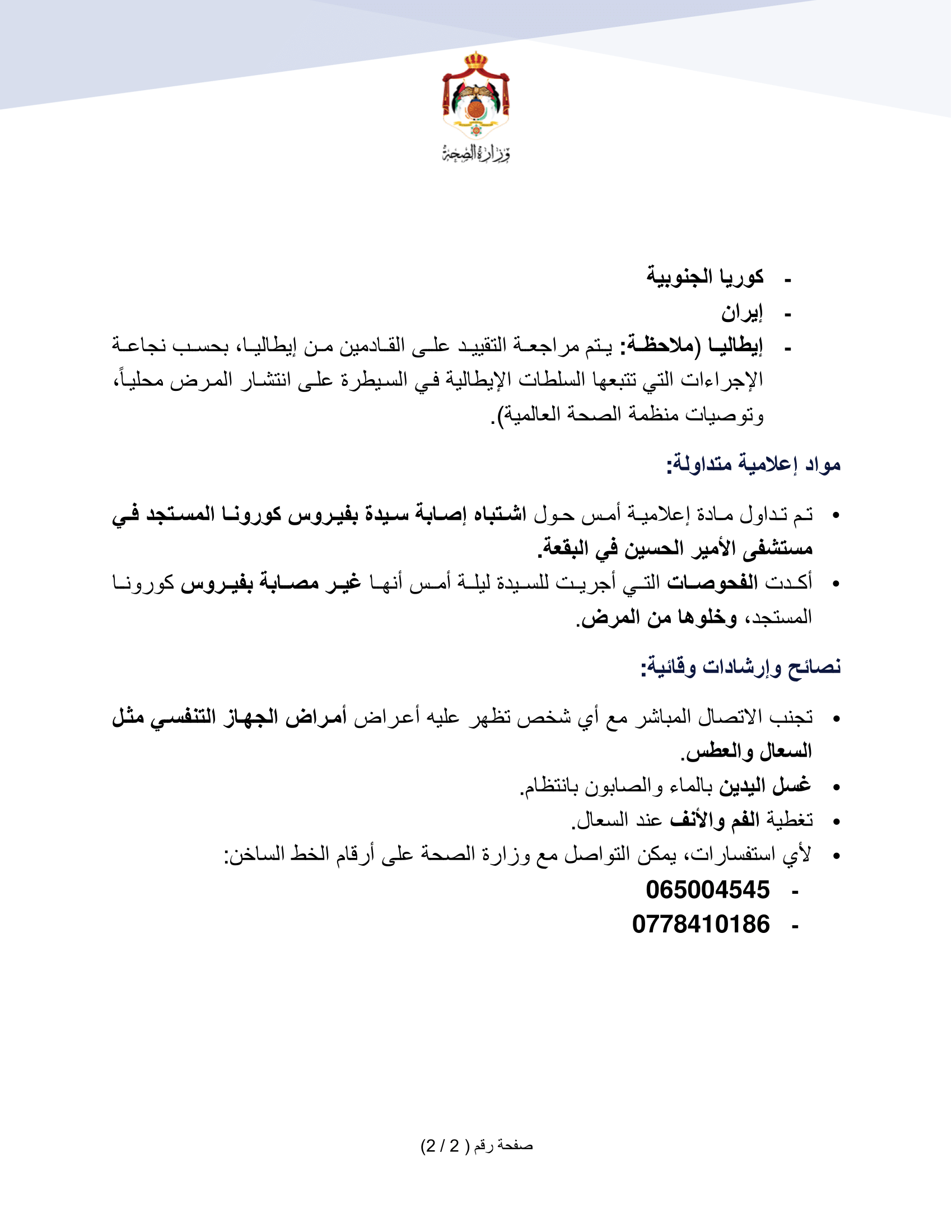 وبينت ان من ابرز الاجراءات تلك التي تتعلق بالسفر الدول التي يمنع حاليا دخول القادمين منها الى الاردن وهي الصين وكرويا الجنوبية وايران وايطاليا.