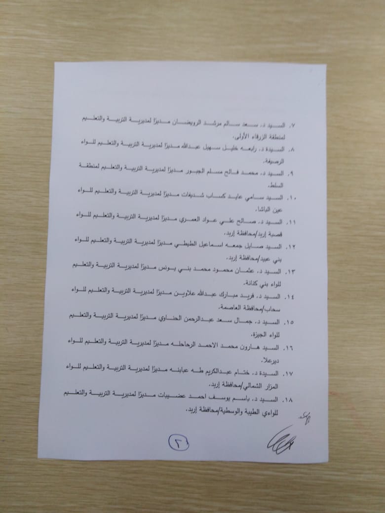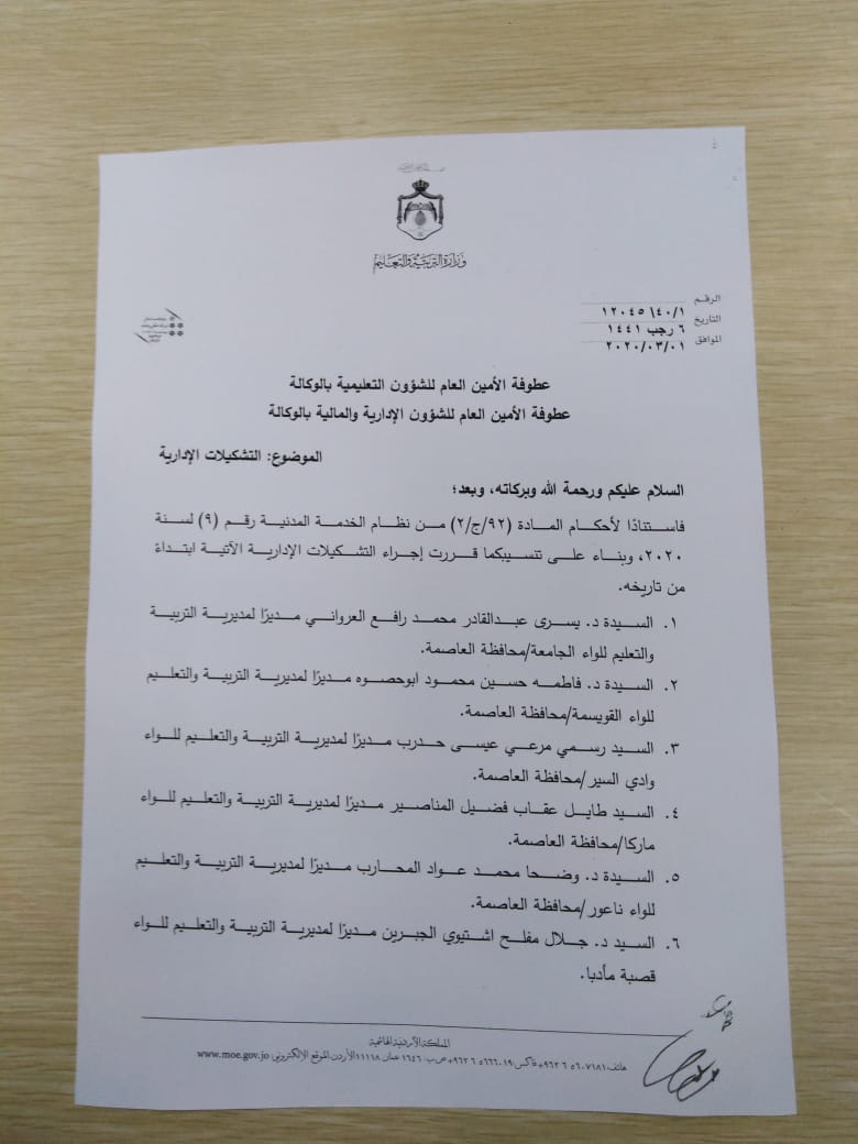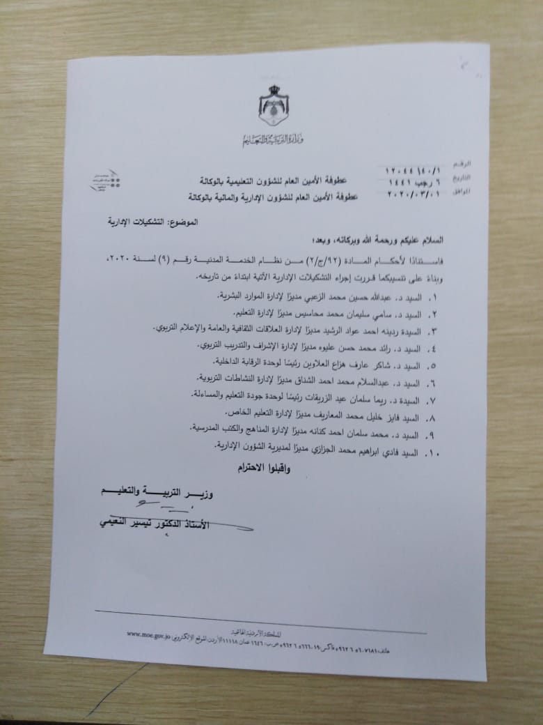 أحداث اليوم - قرر وزير التربية والتعليم الدكتور تيسير النعيمي إجراء التشكيلات الإدارية التالية في الوزارة ابتداءا من تاريخه.وتاليا الأسماء: