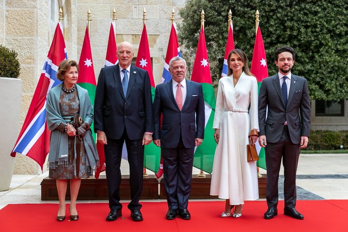 وحضر المباحثات وزير الخارجية وشؤون المغتربين، ومستشار جلالة الملك للاتصال والتنسيق، ومستشار جلالة الملك للسياسات والإعلام، ووزير الصناعة والتجارة والتموين، والسفير الأردني في النرويج. كما حضرها عن الجانب النرويجي وزيرة الخارجية، ووزيرة التجارة والصناعة، والسفيرة النرويجية في الأردن، والوفد المرافق لملك مملكة النرويج. وكانت قد جرت لجلالة الملك هارالد الخامس، ملك مملكة النرويج، وجلالة الملكة سونيا، مراسم استقبال رسمية في قصر الحسينية، حيث كان في مقدمة مستقبليهما جلالة الملك عبدالله الثاني، وجلالة الملكة رانيا العبدالله، وسمو الأمير الحسين بن عبدالله الثاني، ولي العهد.