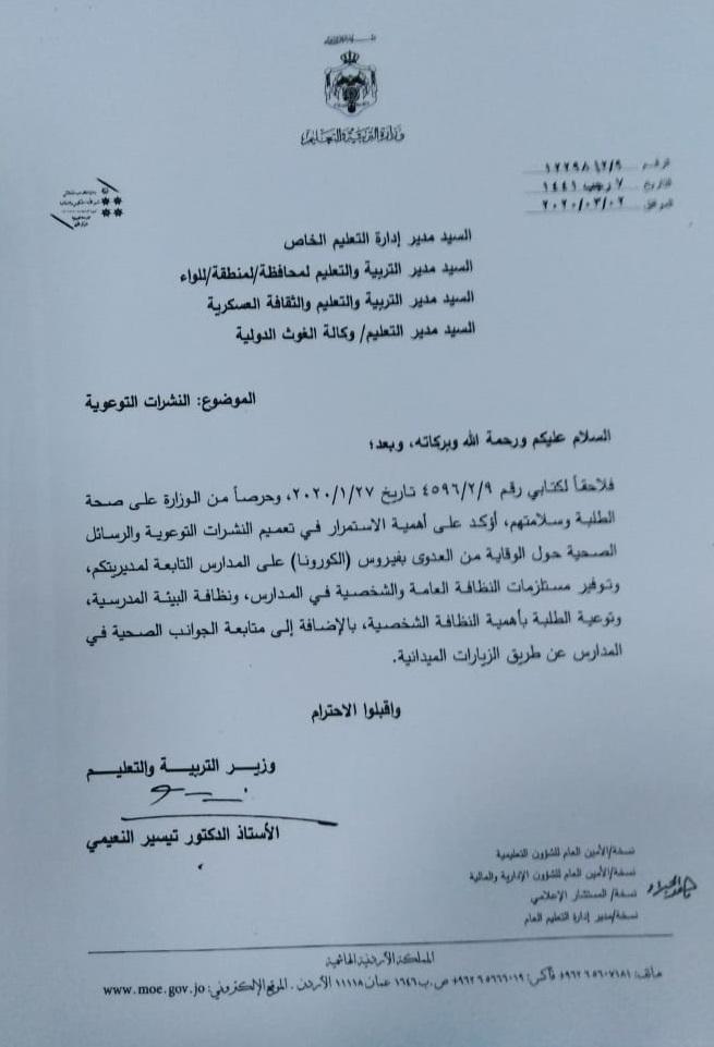 وفي تعميم من وزارة التربية والتعليم، أكد النعيمي أهمية الاستمرار في تعميم نشرات توعوية وصحية حول الوقاية من العدوى بفيروس كورونا على المدارس.