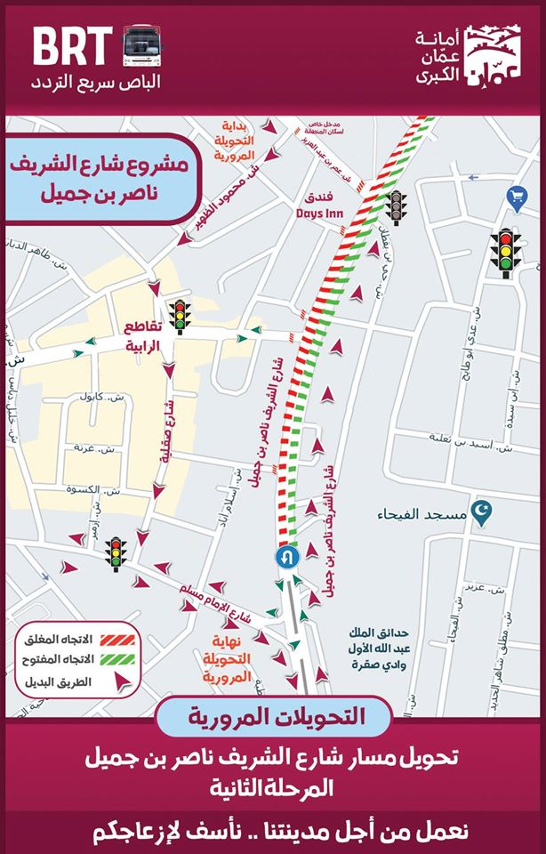 أحداث اليوم - أعلنت أمانة عمان، الأربعاء، عن إغلاق الطريق الممتد من إشارة "الديز ان" ولغاية تقاطع شارع الشريف ناصر بن جميل مع شارع الإمام مسلم قبل إشارات وادي صقرة، اعتبارً من يوم الجمعة المقبل، وذلك ضمن الأعمال الإنشائية لمشروع الباص السريع.