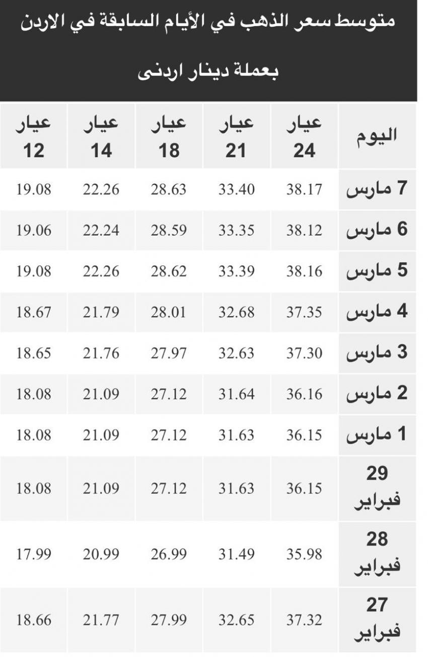 وتحتوي أيضا علي مخطط بمعدل الارتفاع والانخفاض في اسعار الذهب اليوم في الاردن في الأيام السابقة في السوق الأردني.