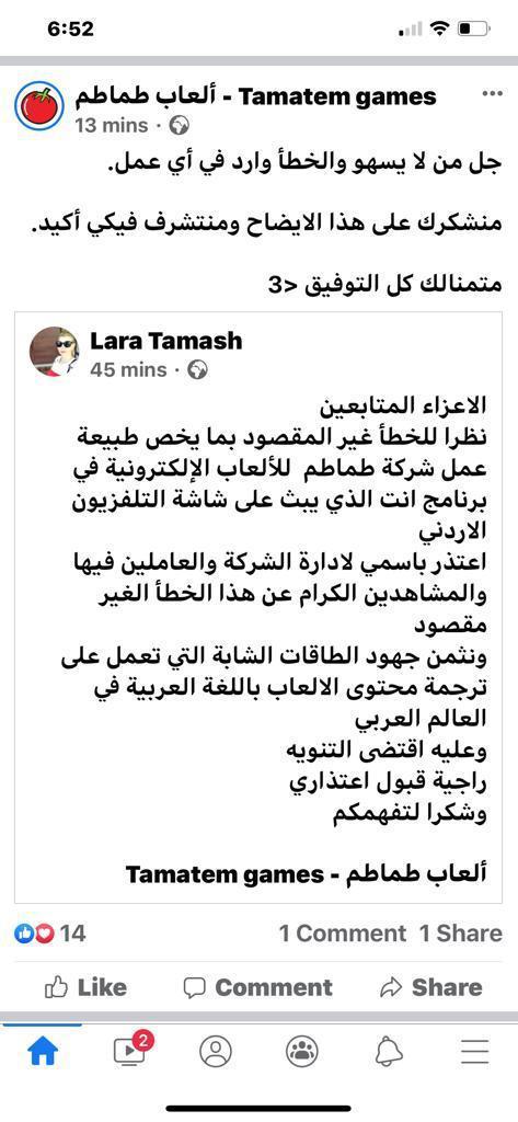 وأضافت، "نثمن جهود الطاقات الشابة التي تعمل على ترجمة محتوى الألعاب باللغة العربية في العالم العربي وعليه اقتضى التنويه راجية قبول اعتذاري".