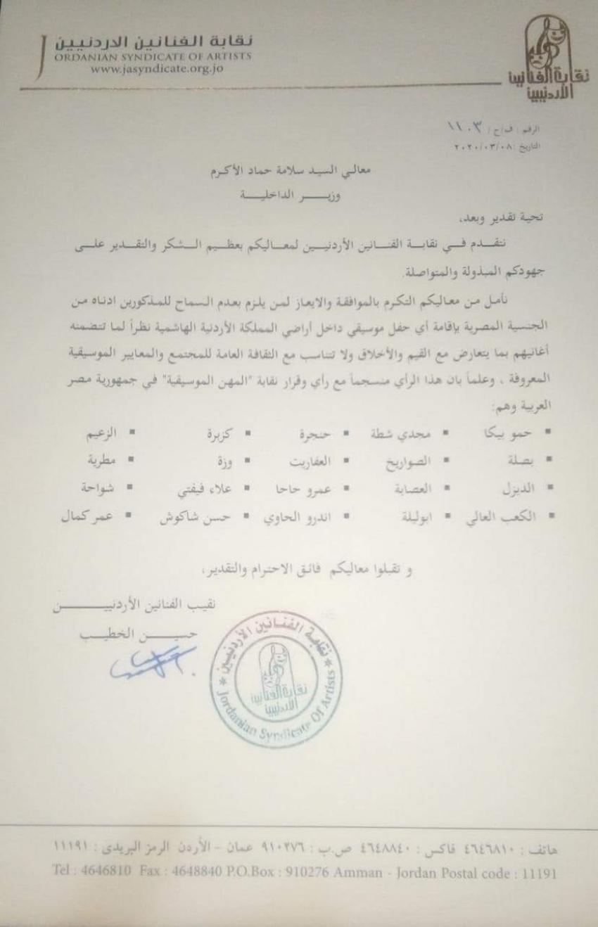 وقالت النقابة، في الكتاب الموجه لوزير الداخلية، إن السبب يعود إلى ما يقدمه الـ20 فنان من أغاني تتعارض مع القيم والاخلاق الأردنية ولا تتناسب مع الثقافة العامة.