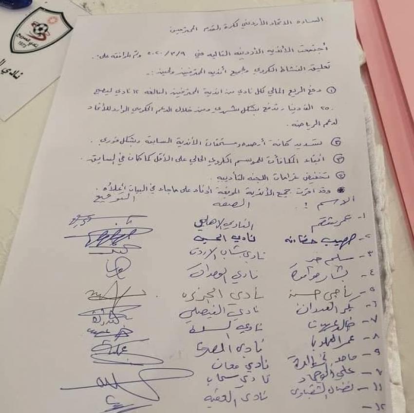 وطالب الدكتور زياد الرميلي – الذي ألقى نص البيان في المؤتمر الصحفي – اتحاد الكرة بتسديد أرصدة الأندية وإبقاء مكافآت البطولات للموسم الكروي كما كانت عليه بالسابق، كما تم اتخاذ قرار بتشكيل لجنة مكونة من ممثلي أندية الوحدات والفيصلي والحسين وسحاب والسلط والجزيرة منسقا، من أجل التفاوض مع اتحاد كرة القدم. (الغد)