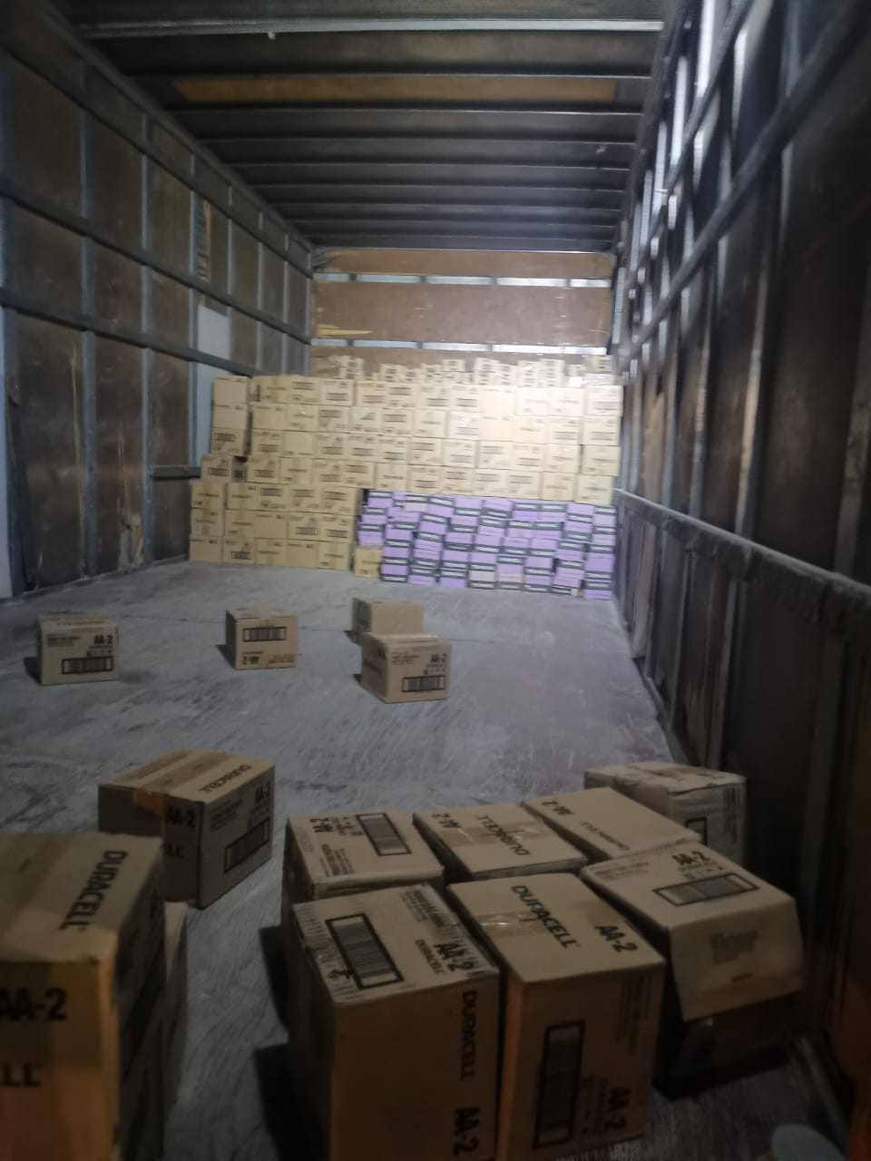 وشملت ايضاً ضبط شاحنتين على الطريق الصحراوي محملات بالبضائع المختلفة ابرزها كميات كبيرة من الهيل والصنوبر والفستق الحلبي إضافة إلى كميات كبيرة من الاجهزة الخلوية واكسسوارتها.
