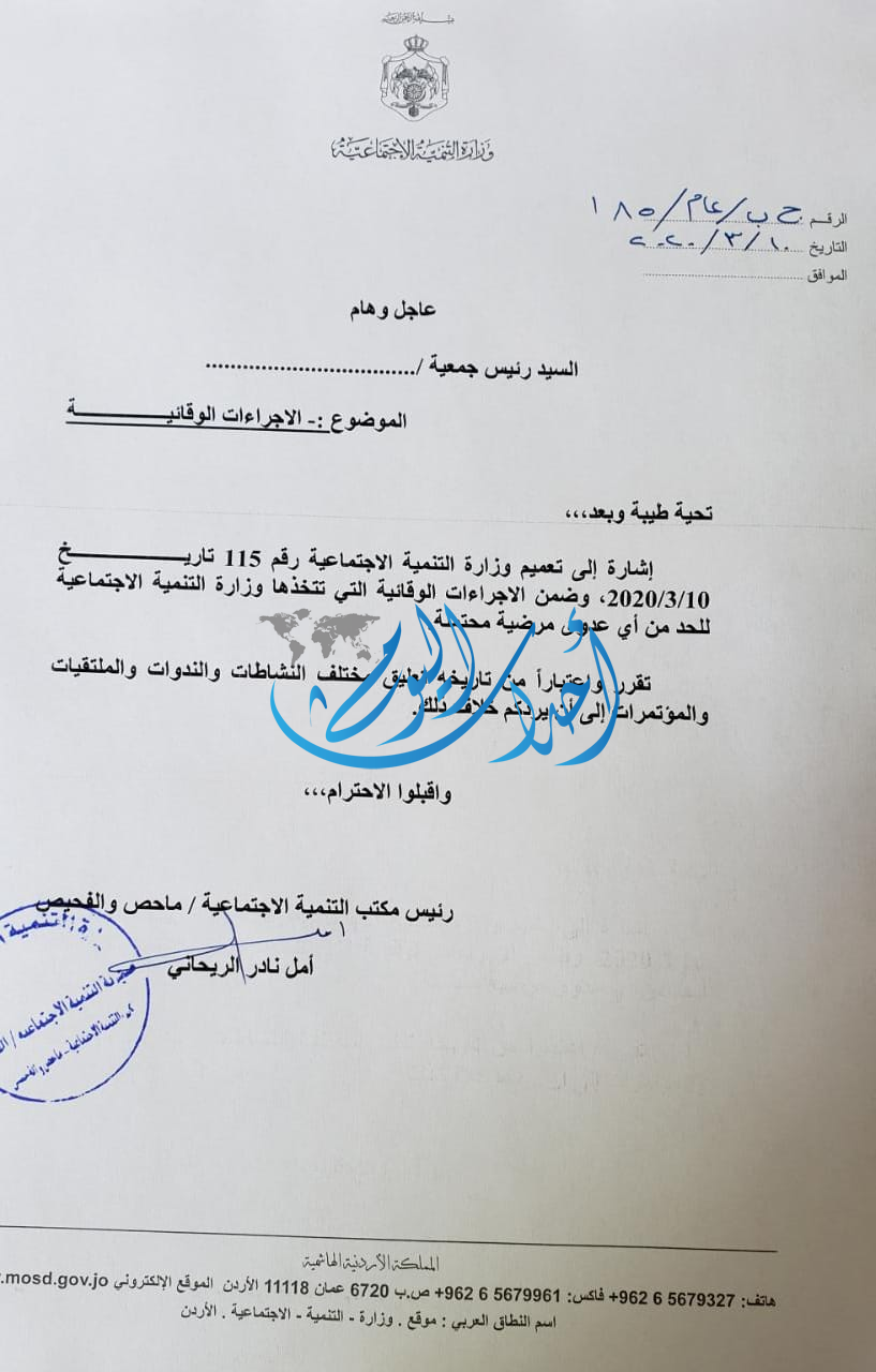 وأشارت الوزارة في تعميم عاجل وصل "أحداث اليوم" نسخه منه، مُوجه إلى الجمعيات الأردنية إلى أن هذا الإجراء يأتي للحد من انتشار عدوى فيروس كورونا، مؤكدة أن هذا القرار سيبقى سارٍ إلى أن يرد خلاف ذلك.