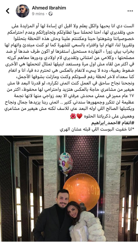 خلاف أنغام وأحمد إبراهيم يعود لعدة أشهر سابقة، لكنه عاد واشتعل أمس، الأحد، مع قيام الأخير بنشر صورة طليقته ياسمين عيسى بدلاً من زوجته انغام، مع تضمينها برسالة قال فيها: "في يوم المرأة العالمي تحية للعظيمة الأمينة اللي صانت بيتي في غيابي عرفت قيمة ولاد الأصول مراتي وام ولادي".