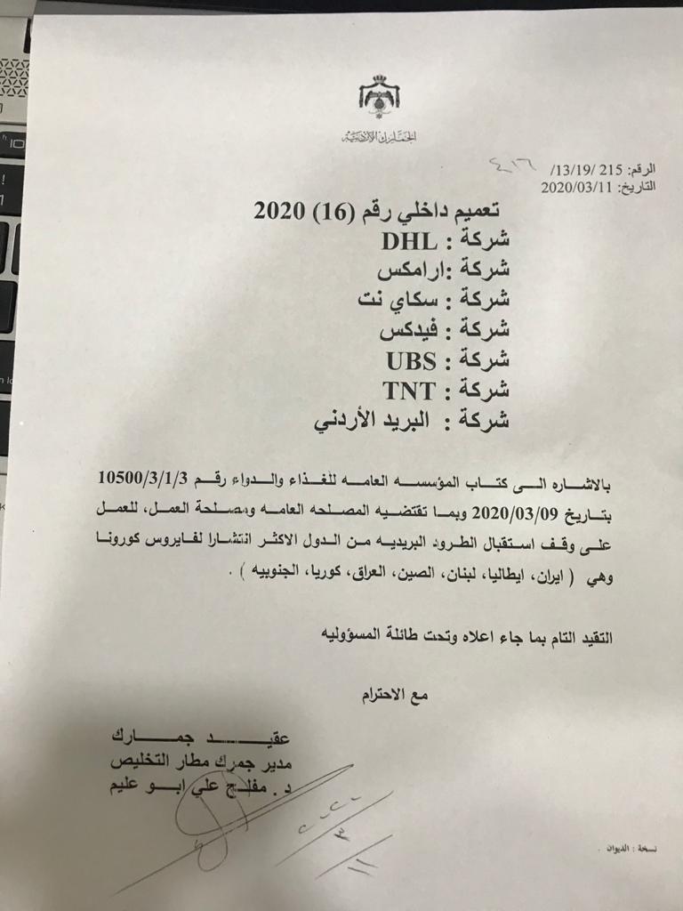 أحداث اليوم - عممت دائرة الجمارك على شركات البريد بوقف استقبال الطرود البريدية من الدول الأكثر انتشارا لفيروس كورونا وهي (إيران وإيطاليا، لبنان، الصين، العراق، كوريا الجنوبية)