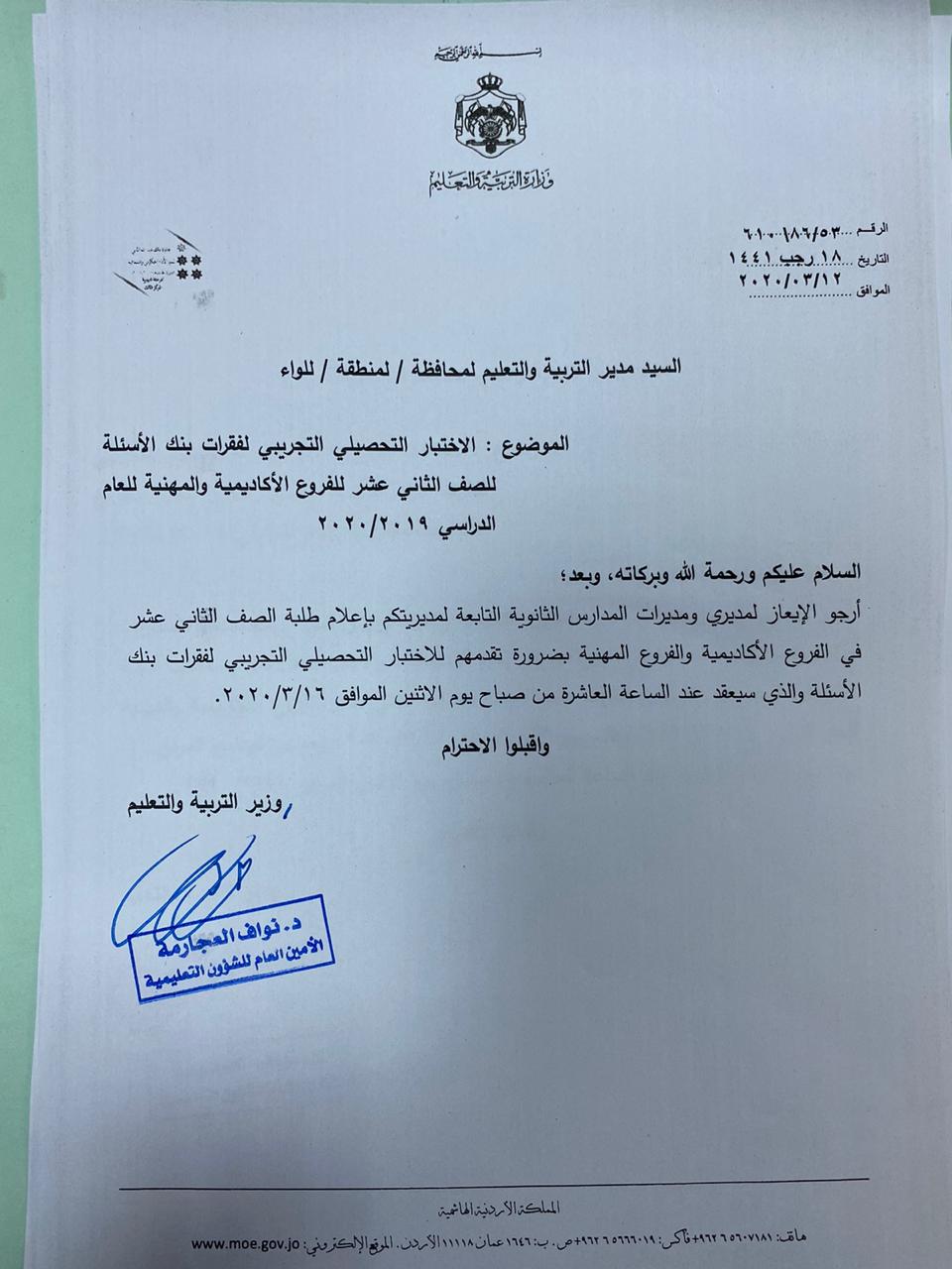 قررت وزارة التربية والتعليم، إجراء الاختبار التحصيلي التجريبي لفقرات بنك الاسئلة للصف الثاني عشر "التوجيهي" للفروع الاكاديمية والمهنية الساعة العاشرة من صباح يوم الاثنين المقبل السادس عشر من الشهر الحالي.