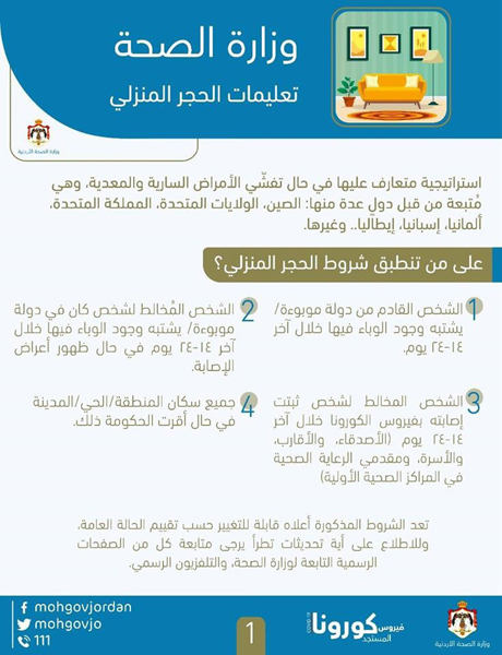 وبينت التعليمات ان مدة الحجر 14 يوما قد تصل الى 24 يوما وهي فترة حضانة الفيروس.