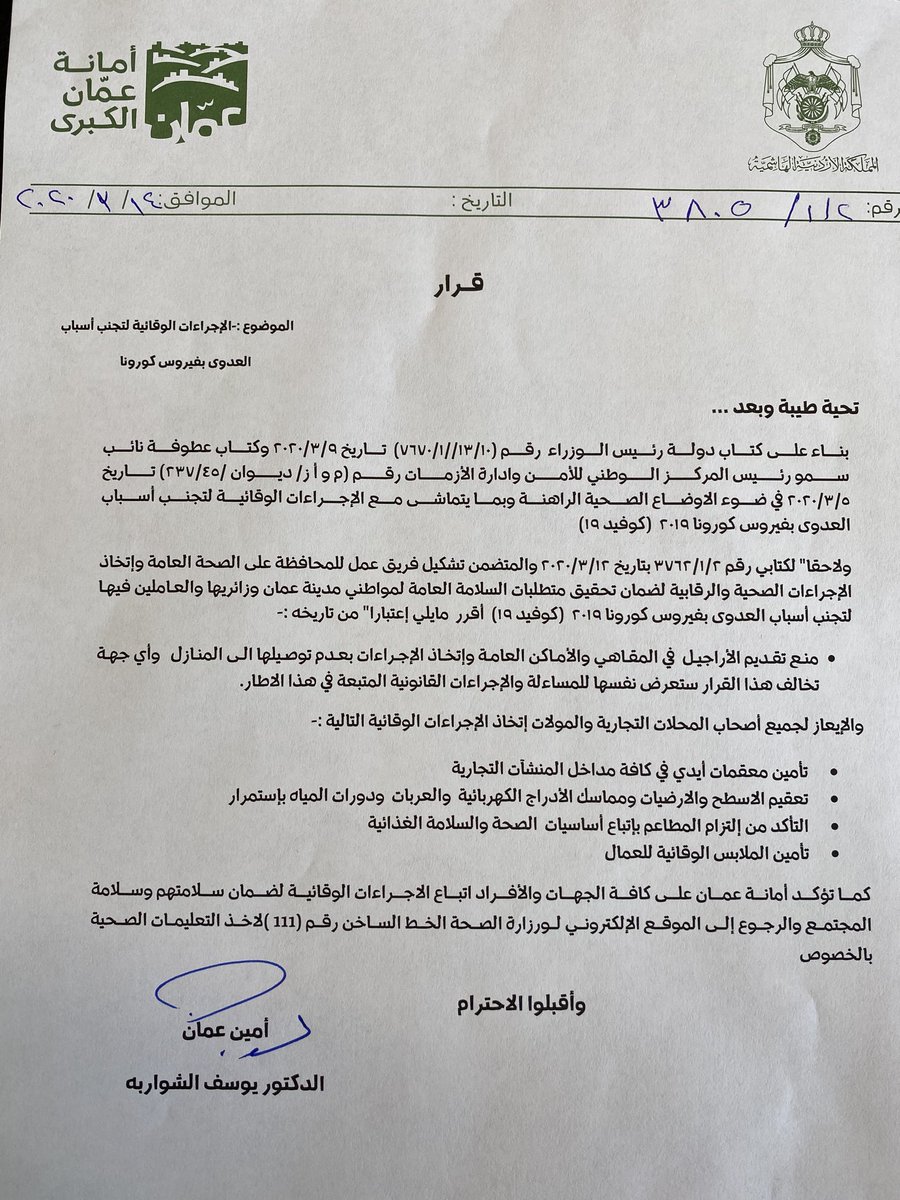 أحداث اليوم - عمم أمين عمان يوسف الشواربة، السبت، بمنع تقديم "الأراجيل" في المقاهي والأماكن العامة في عمّان.وأكد الشواربة أن أي جهة تخالف هذا القرار ستعرض نفسها للمساءلة والاجراءات القانونية المتبعة في هذا الاطار.وتالياً نص التعميم: