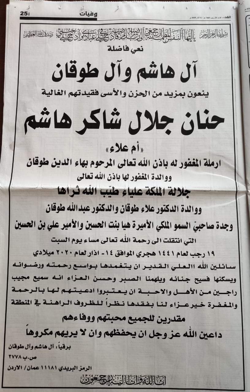 ونعى ال هاشم وال طوقان المرحومة حنان جلال هاشم ، ارملة المرحوم بهاء الدين طوقان ، ووالدة المغفور لها الملكة علياء ، ووالدة الدكتور علاء طوقان والدكتور عبد الله طوقان ، وجدة الاميرة هيا بنت الحسين ، والأمير علي ابن الحسين ، والتي انتقلت الى رحمته تعالى السبت 14 آذار الجاري.