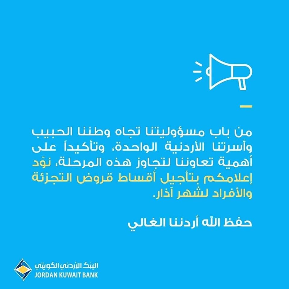 أحداث اليوم - اعلن البنك الاردني الكويتي عن تأجيل استحقاق اقساط قروض التجزئة والأفراد لشهر آذار الحالي.