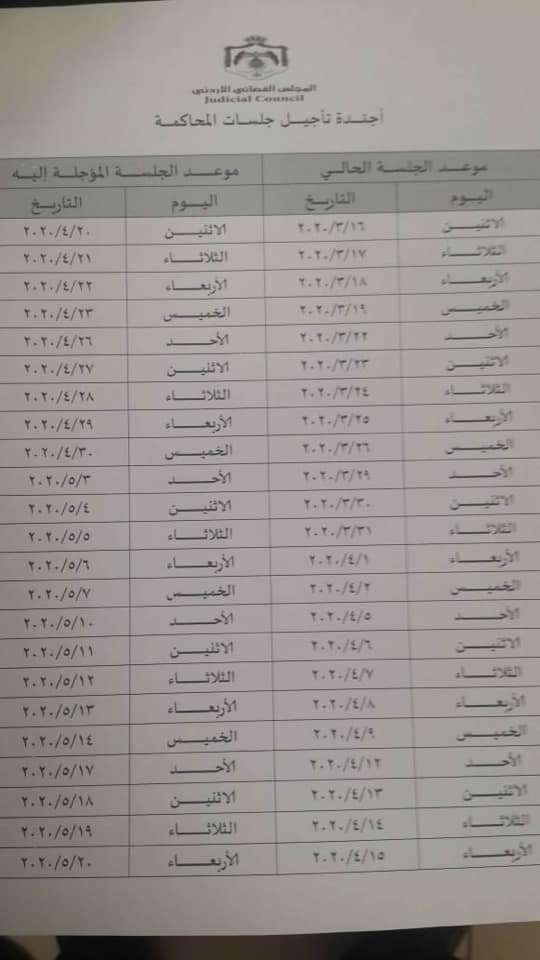 قرر المجلس القضائي اليوم الاحد، تأجيل النظر بكافة القضايا المحددة جلساتها بفترة من 16-3 وحتى 15-4 مدة شهر دون الحاجة لحضور الخصوم، واعتبار الاطراف متفهمين للموعد الجديد للجلسات.