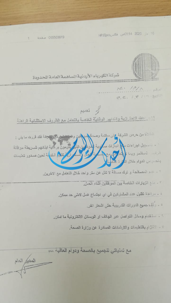 وحسب كتاب حصلت "احداث اليوم" على نسخة عنه تقر منح الإجازات للموظفين الذين يقومون برعاية أبناءهم شريطة موافقة الإدارة العامة، ومنع المصافحة بين الموظفين في الشركة ووقف الدورات التدريبة.