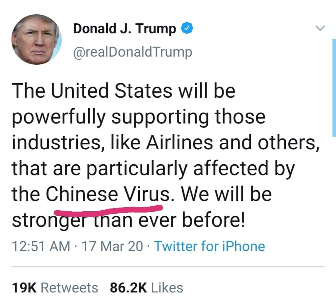 يذكر بأن ترامب اشار في تصريح له على موقع التواصل الاجتماعي، الى انه "ستدعم الولايات المتحدة بقوة تلك الصناعات، مثل الخطوط الجوية وغيرها، التي تتأثر بشكل خاص بالفيروس الصيني".
