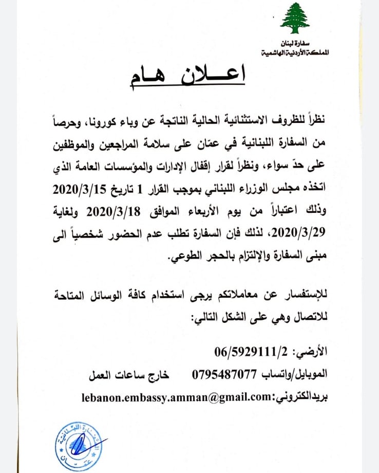 أحداث اليوم - دعت السفارة اللبنانية في عمان، جميع المراجعين الى عدم الحضور للسفارة بشكل شخصي والالتزام بالحجر الطوعي.