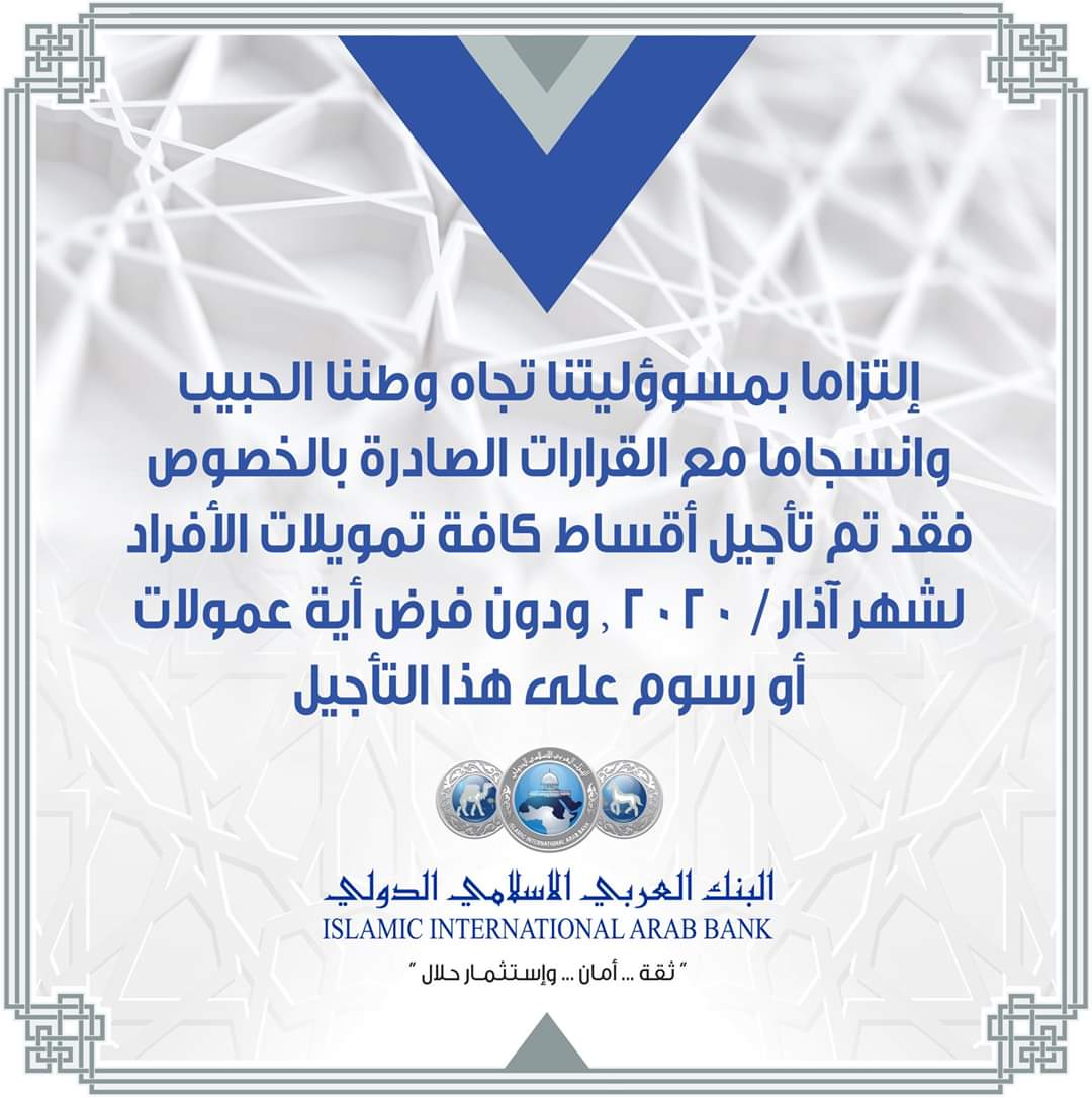 أحداث اليوم - قرر البنك العربي الإسلامي، تأجيل أقساط كافة تمويلات الأفراد لشهر آذار الحالي، للتخفيف عن المواطنين في ظل الأزمة التي تعيشها البلاد والإجراءات الحكومية لمنع انتشار فيروس كورونا.