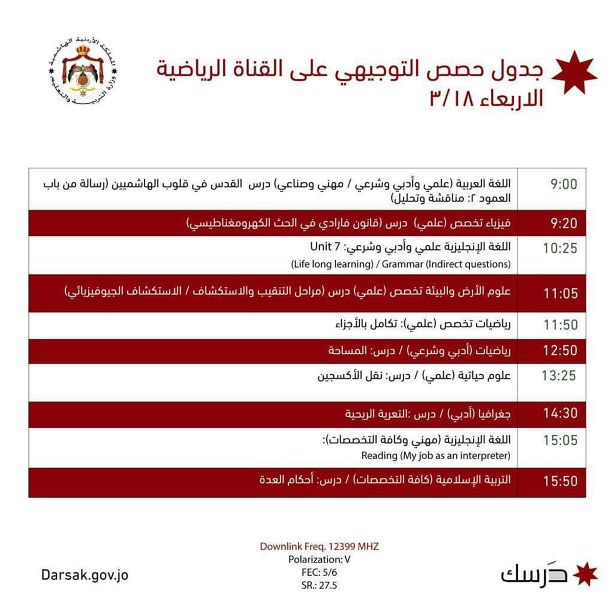 جدول الدروس المتلفزة لطلبة التوجيهي الاربعاء