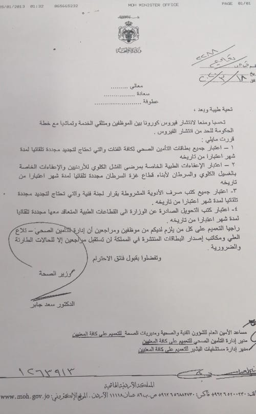 وشمل القرار الذي وصل احداث اليوم نسخه منه، على اعتبار كل الإعفاءات الطبية الخاصة بمرضى الفشل الكلوي للأردنيين ومرضى الغسيل الكلوي والسرطان لأبناء قطاع غزة مجددة تلقائياً لمدة شهر.