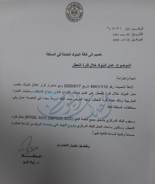 بدوره أكد البنك المركزي الأردني، الأربعاء، أن الخدمات المصرفية الملحّة في البنوك تقتصر على خدمة الإيداعات النقدية وإيداع الشيكات وعمليات التجارة الخارجية.
