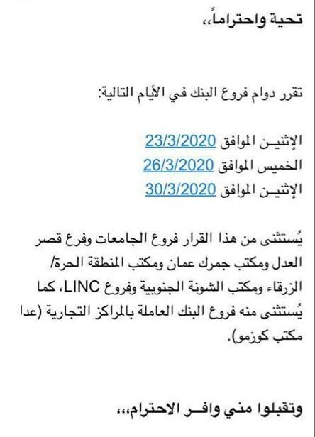 أحداث اليوم - أحمد بني هاني - تحاول بنوك الالتفاف على قرار تعطيل مؤسسات القطاع الخاص ضمن الإجراءات الحكومية الاحترازية والوقائية المتعلقة بانتشار فيروس كورونا في الأردن، وفق مصادر.