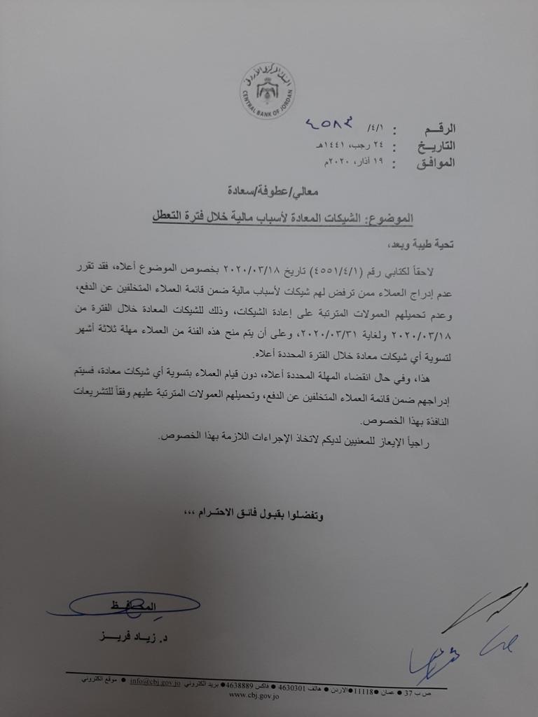 وجاء في التعميم الذي وجه لمدراء البنوك، عدم تحميل هؤلاء العملاء العمولات المترتبة على إعادة الشيكات وذلك للشيكات المعادة خلال الفترة من 18/3 - 31/3 وأن يتم هذه الفئة مهلة لمدة 3 اشهر لتصويب الأوضاع وتسوية أي شيكات.