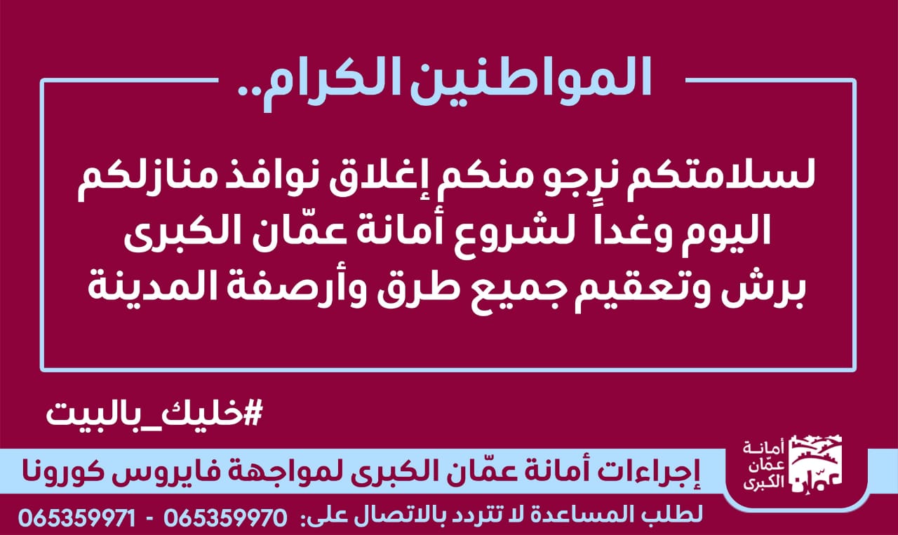 أحداث اليوم - دعت أمانة عمان الكبرى السبت ،في منشور لها إغلاق المواطنين نوافذ المنازل اليوم وغدا لشروعها برش وتعقيم جميع طرق وأرصفة المدينة.
