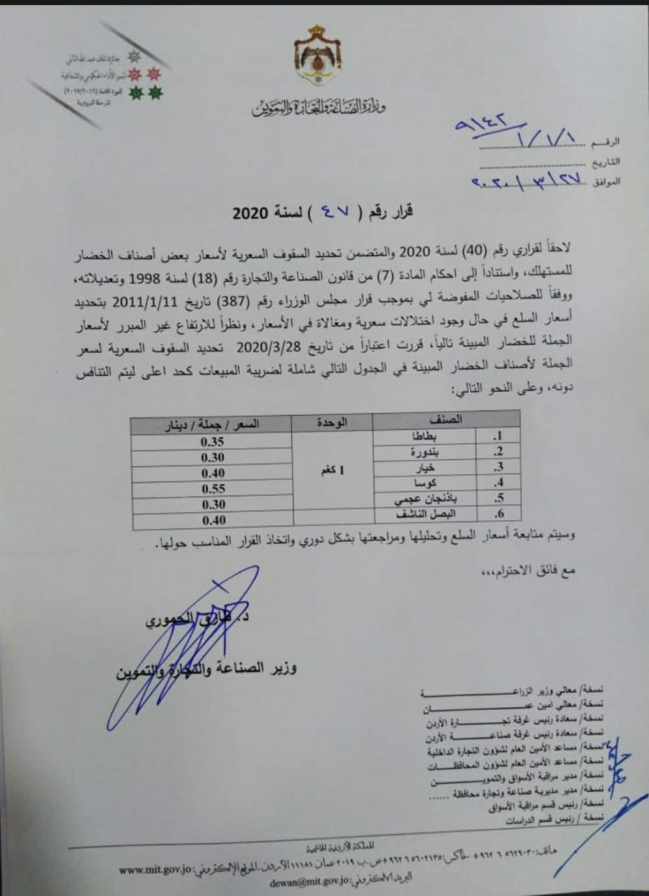 أحداث اليوم - قرر وزير الصناعة والتجارة الدكتور طارق الحموري تحديد سقوف سعرية لأسعار بعض أصناف الخضار للمستهلك.