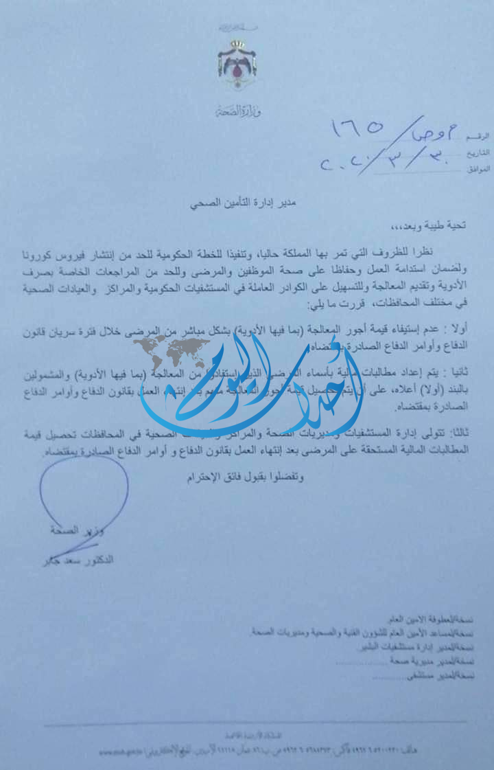 وأوعز جابر بان تقوم المستشفيات والمراكز الصحية ومديريات الصحة باستيفاء الرسوم من المستفيدين بعد وقف العمل بقانون الدفاع والأوآمر الصادرة بمقتضاه.
