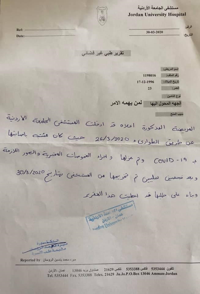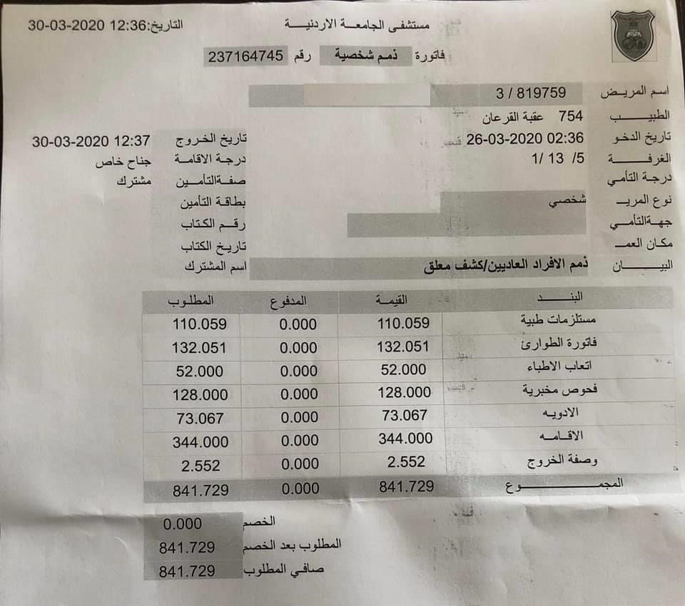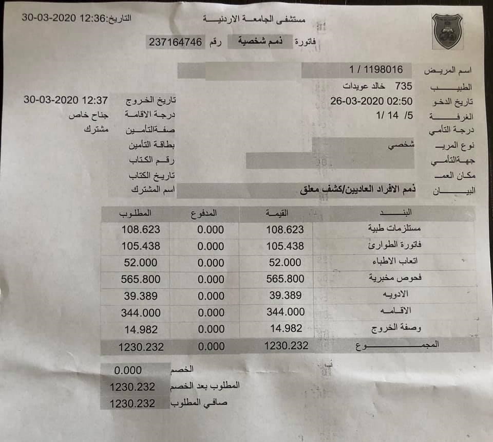 ونشرت سيدة صوراً لتقرير طبي وفاتورتين علاجيتين الأولى بقيمة 841 دينارا والثانية بقيمة 1230 دينارا، قالت انها بدلا عن فحوصات لفيروس كورونا تمت في مستشفى الجامعة الاردنية.