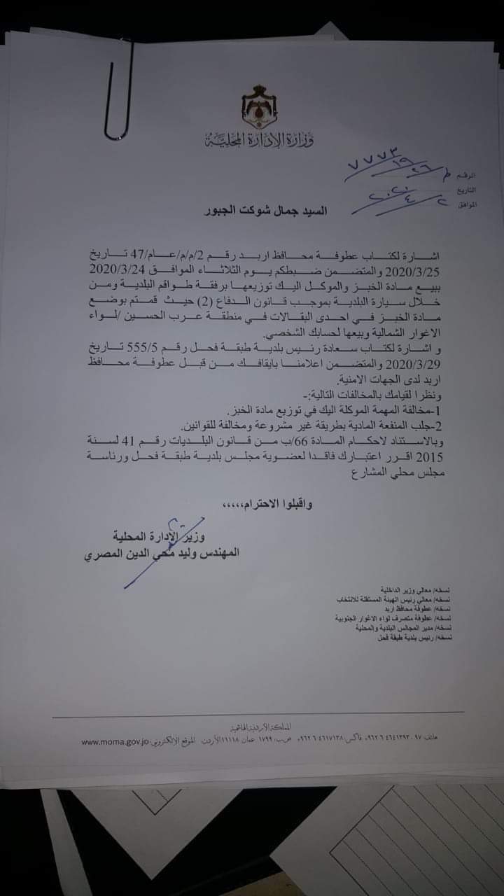 وجاء في كتاب صادر عن وزارة الادارة المحلية ، ان وبناء على مخالفة المذكور للمهمة الموكلة اليه في توزيع الخبز ، وجلب المنفعة المالية بطريقة غير مشروعة ومخالفة للقوانين واستنادا لاحكام المادة 66ب من قانون البلديات رقم 41 لسنة 2015 اقرر اعتبارك فاقدا لعضوية مجلس بلدية طبقة فحل ورئاسة مجلس محلي المشارع .