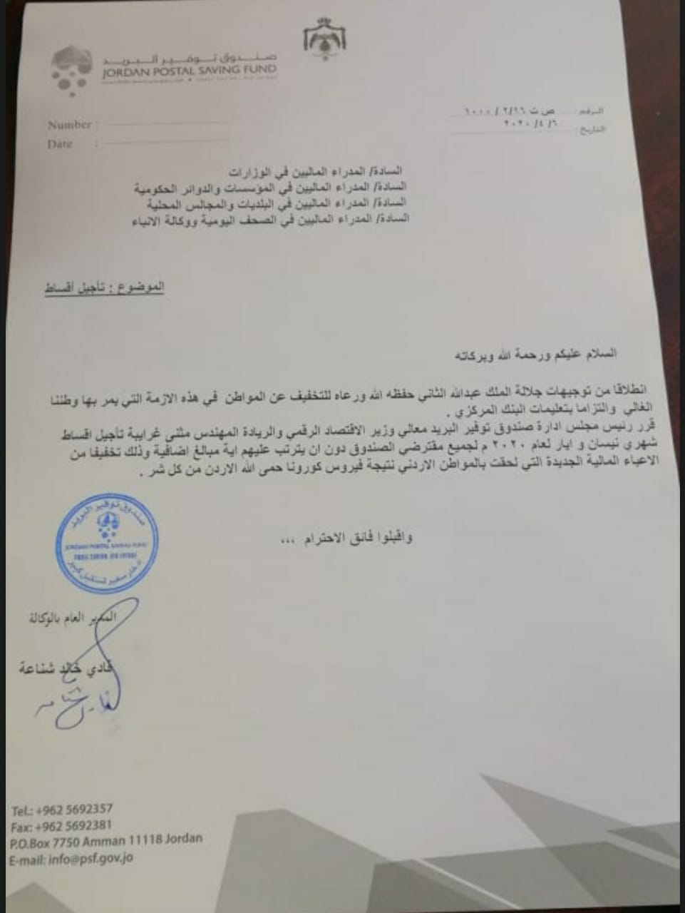 وجاء في القرارا ان هذا التأجيل لا يترتب عليه اية مبالغ اضافية ، وذلك للتخفيف من الاعباء المالية الجديدة التي لحقت بالمواطن الاردني نتيجة فيروس كورونا.