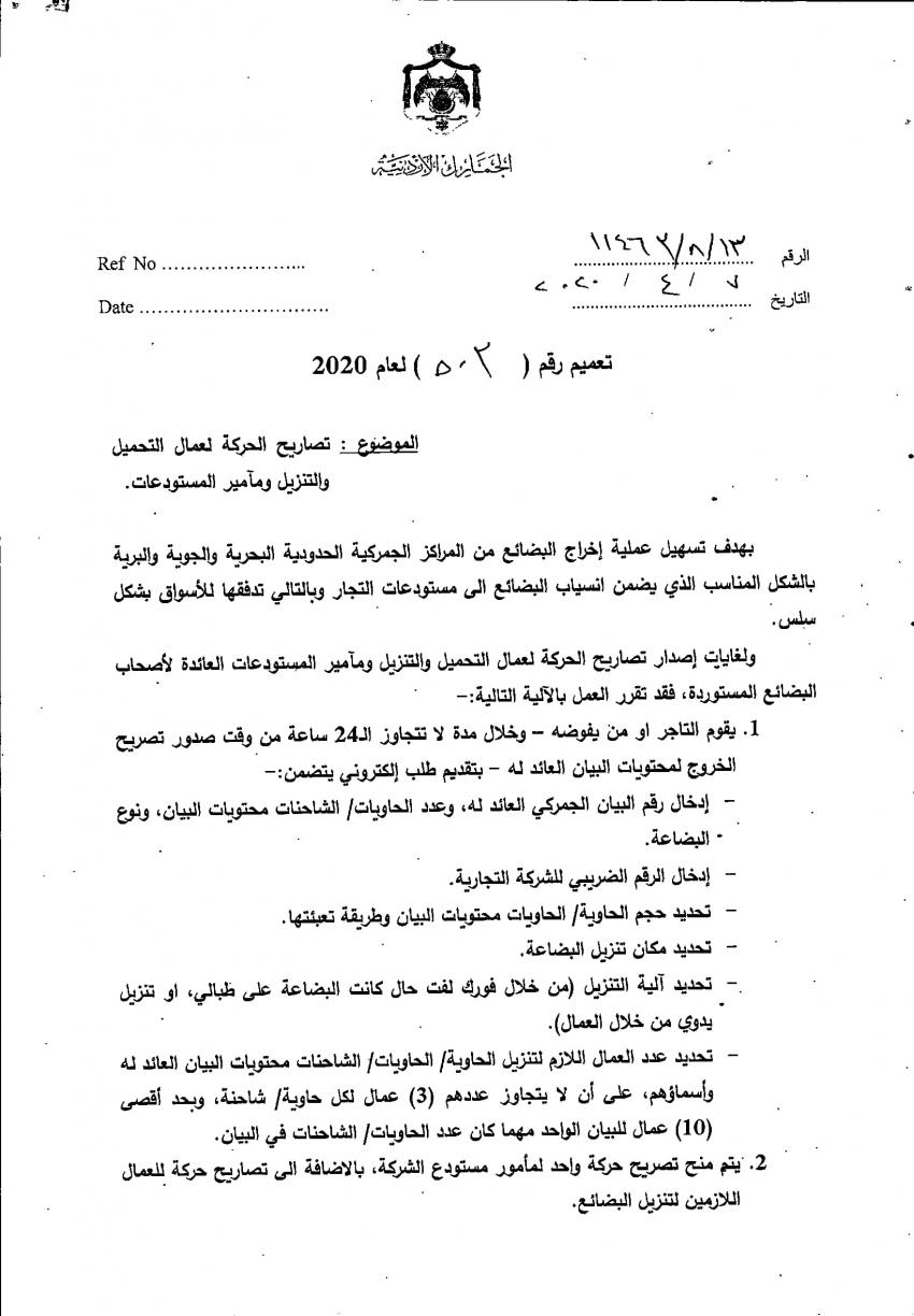 أحداث اليوم - أصدرت دائرة الجمارك العامة تعميماً لغايات تسهيل عملية اخراج البضائع من المركز الجمركية الحدوية الجوية والبحرية والبرية بالشكل المناسب والذي يضمن انسياب البضائع إلى مستودعات التجار وتدفقها للأسواق بشكل سلس.