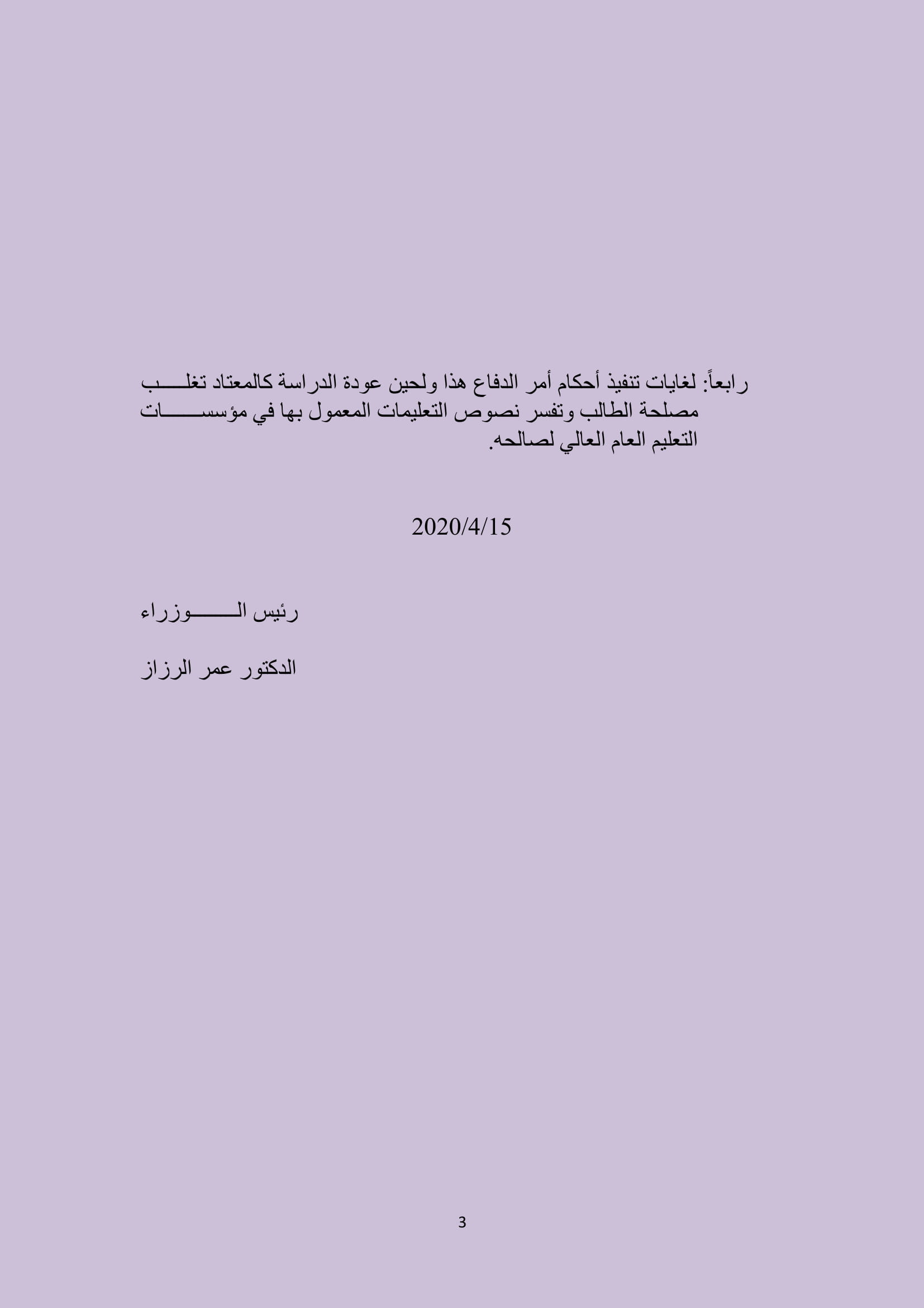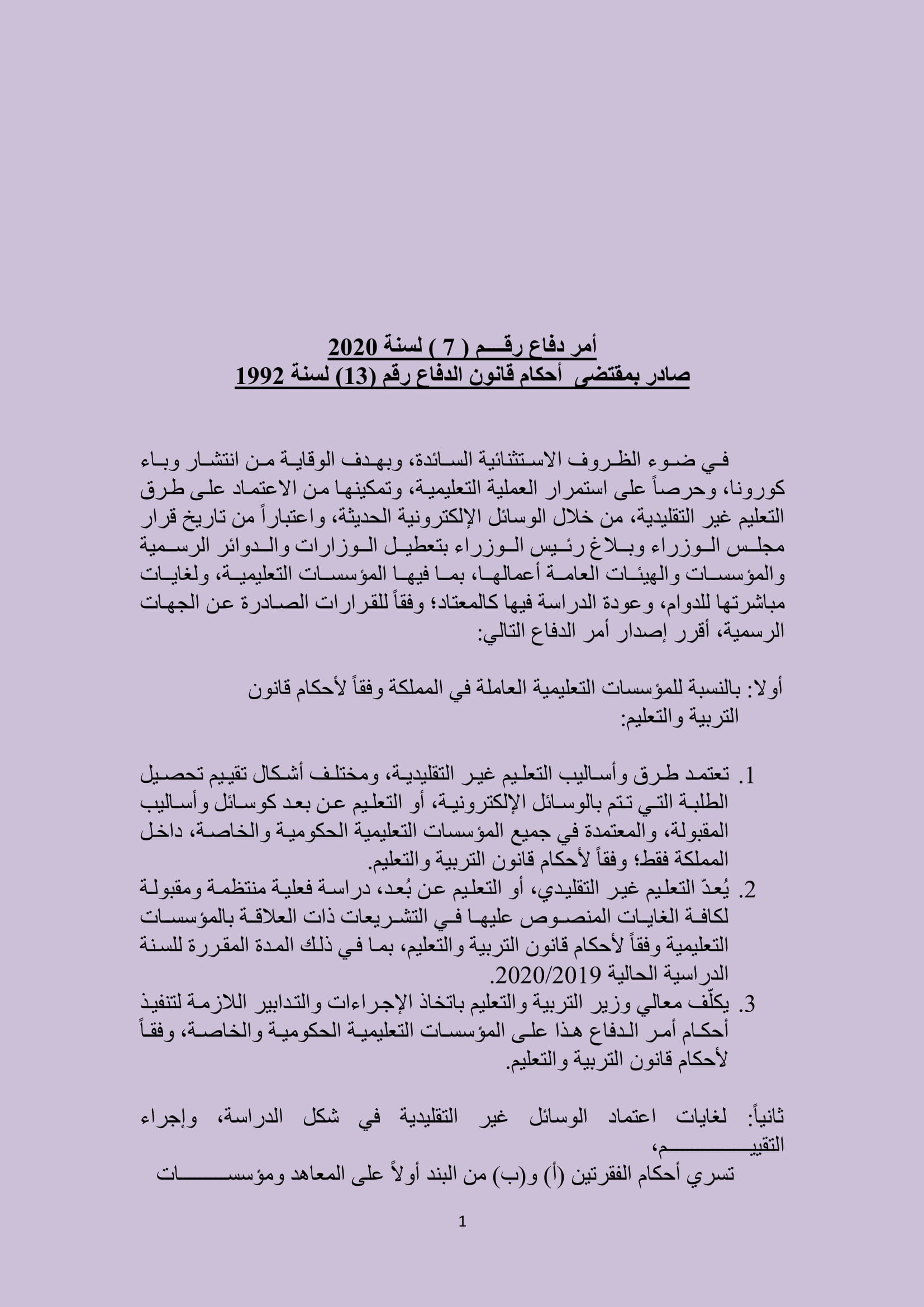 أمر دفاع رقــــم ( 7 ) لسنة 2020صادر بمقتضى أحكام قانون الدفاع رقم (13) لسنة 1992 في ضوء الظروف الاستثنائية السائدة، وبهدف الوقاية من انتشار وباء كورونا، وحرصاً على استمرار العملية التعليمية، وتمكينها من الاعتماد على طرق التعليم غير التقليدية، من خلال الوسائل الإلكترونية الحديثة، واعتباراً من تاريخ قرار مجلس الوزراء وبلاغ رئيس الوزراء بتعطيل الوزارات والدوائر الرسمية والمؤسسات والهيئات العامة أعمالها، بما فيها المؤسسات التعليمية، ولغايات مباشرتها للدوام، وعودة الدراسة فيها كالمعتاد؛ وفقاً للقرارات الصادرة عن الجهات الرسمية، أقرر إصدار أمر الدفاع التالي: