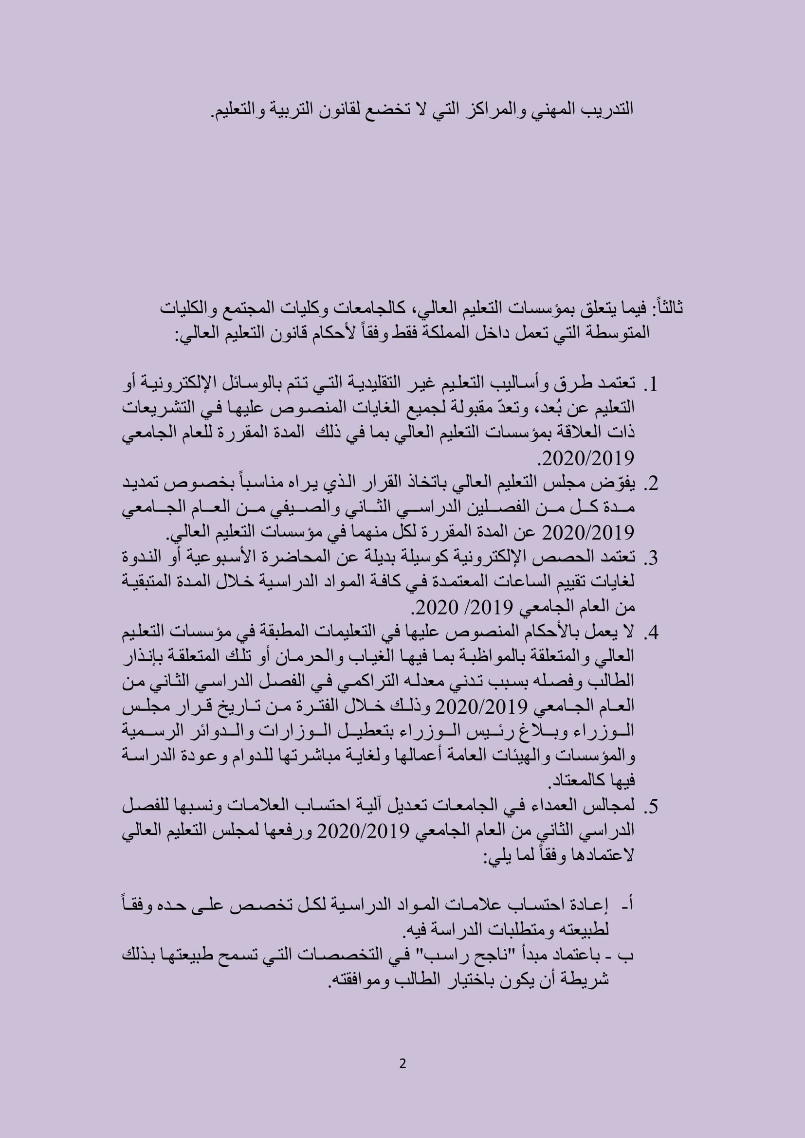 ثالثاً: فيما يتعلق بمؤسسات التعليم العالي، كالجامعات وكليات المجتمع والكليات المتوسطة التي تعمل داخل المملكة فقط وفقاً لأحكام قانون التعليم العالي: تعتمد طرق وأساليب التعليم غير التقليدية التي تتم بالوسائل الإلكترونية أو التعليم عن بُعد، وتعدّ مقبولة لجميع الغايات المنصوص عليها في التشريعات ذات العلاقة بمؤسسات التعليم العالي بما في ذلك المدة المقررة للعام الجامعي 2019/2020.