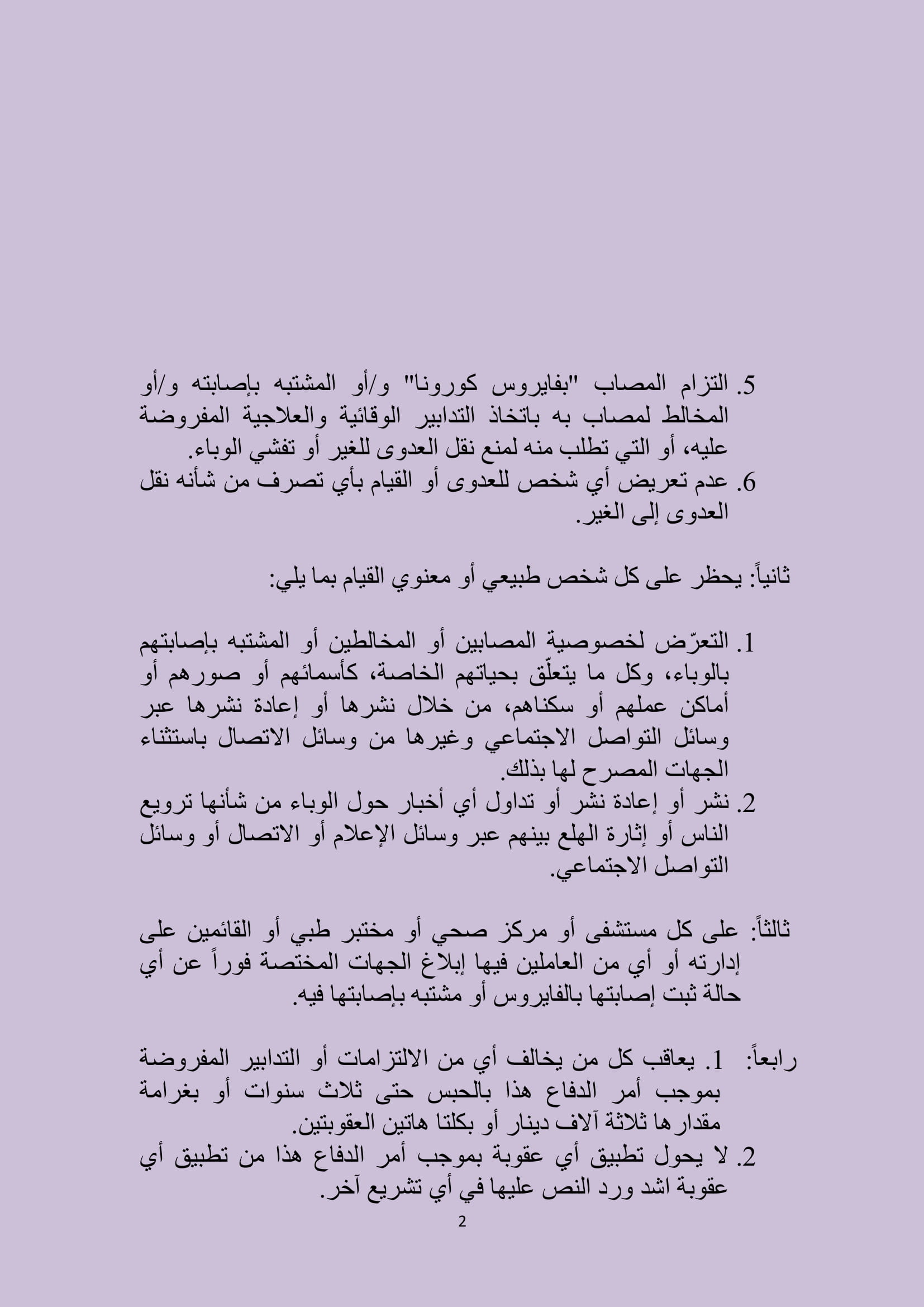 5. التزام المصاب "بفايروس كورونا" و/أو المشتبه بإصابته و/أو المخالط لمصاب به باتخاذ التدابير الوقائية والعلاجية المفروضة عليه، أو التي تطلب منه لمنع نقل العدوى للغير أو تفشي الوباء.