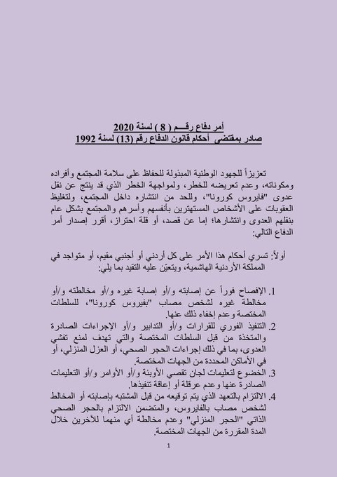 نص أمر الدفاع رقم 8 الذي اعلنه رئيس الوزراء الدكتور عمر الرزاز على حظر التعرض لخصوصية المصابين أو المخالطين أو المشتبه بإصابتهم بالوباء، وكل ما يتعلّق بحياتهم الخاصة، كأسمائهم أو صورهم أو أماكن عملهم أو سكناهم، من خلال نشرها أو إعادة نشرها عبر وسائل التواصل الاجتماعي وغيرها من وسائل الاتصال باستثناء الجهات المصرح لها بذلك.