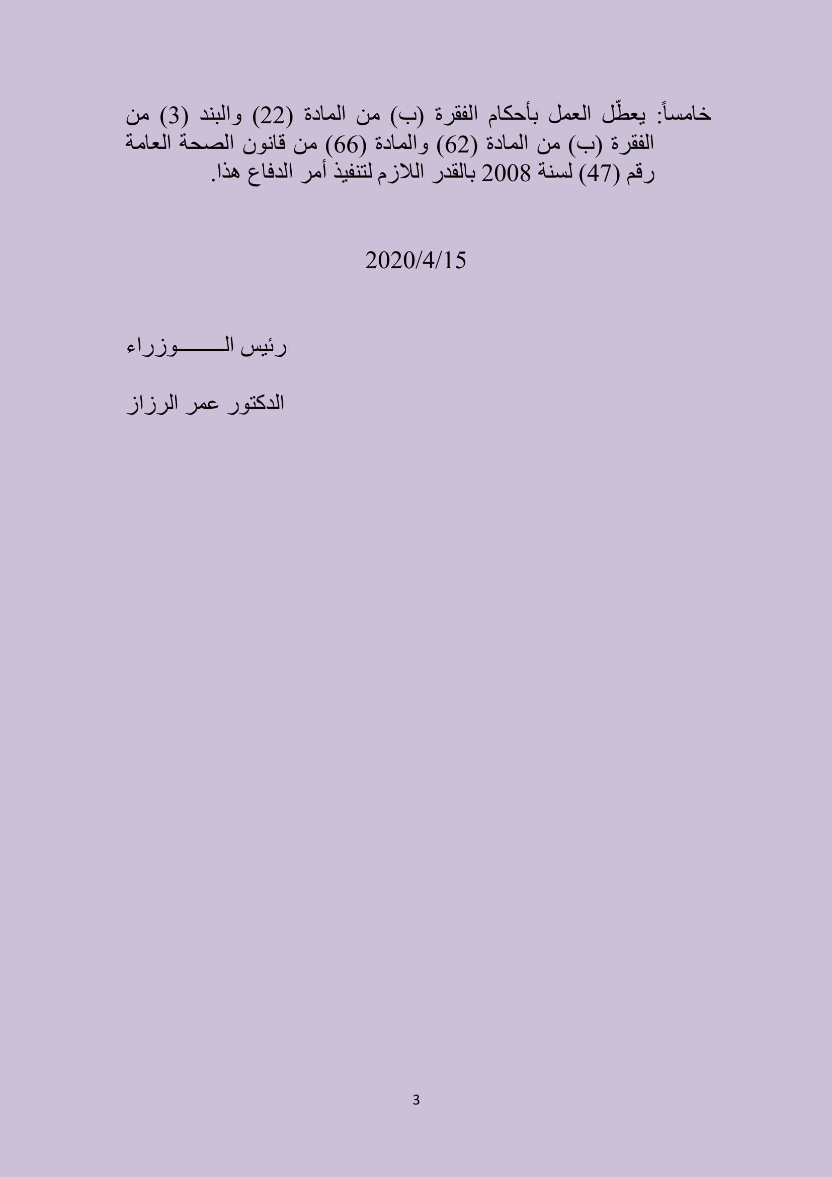 خامساً: يعطّل العمل بأحكام الفقرة (ب) من المادة (22) والبند (3) من الفقرة (ب) من المادة (62) والمادة (66) من قانون الصحة العامة رقم (47) لسنة 2008 بالقدر اللازم لتنفيذ أمر الدفاع هذا.